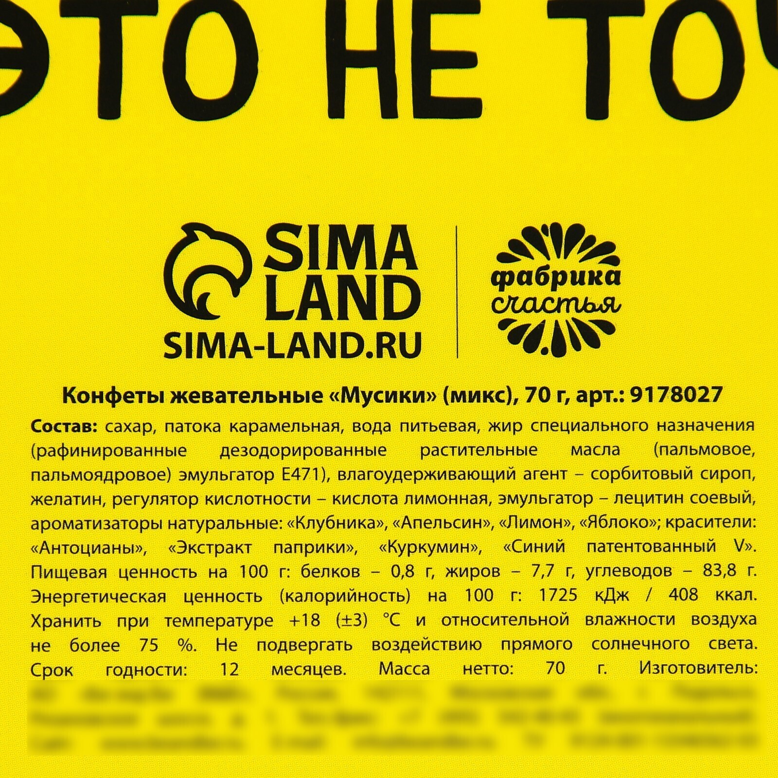 Состав: сахар, патока карамельная, вода питьевая, жир специального назначения (рафинированные дезодорированные растительные масла (пальмовое, пальмоядровое) эмульгатор Е471), влагоудерживающий агент – сорбитовый сироп, желатин, регулятор кислотности – кислота лимонная, эмульгатор – лецитин соевый, ароматизаторы натуральные: «Клубника», «Апельсин», «Лимон», «Яблоко»; красители: «Антоцианы», «Экстракт паприки», «Куркумин», «Синий патентованный V».