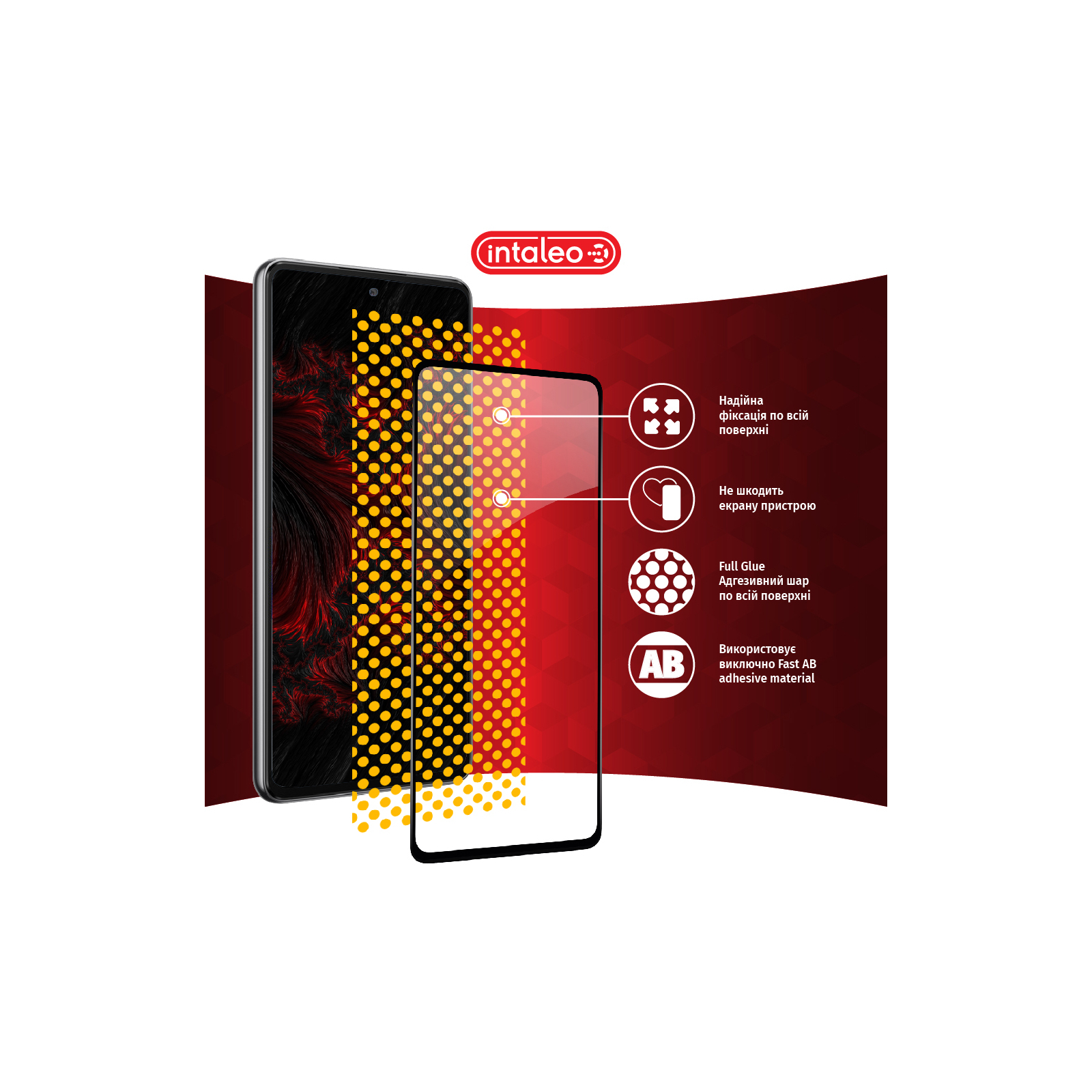 Клейовий шар нанесений на всьому склі. Завдяки цьому, забезпечує надійну та сильну фіксацію всього скла, а не лише його країв. У разі потреби таке скло можна легко зняти без ризику пошкодити екран або його покриття.