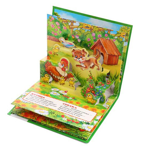 Малыш будет с удовольствием рассматривать красочные картинки и слушать озвученные в виде песенок стихи о домашних животных. Ребёнок легко освоит включение звука: 1 нажатие – проигрывается песенка, 2 нажатие – выключится. Книжка сделана из плотного картона, поэтому родители могут не опасаться, что ребёнок порвёт странички.