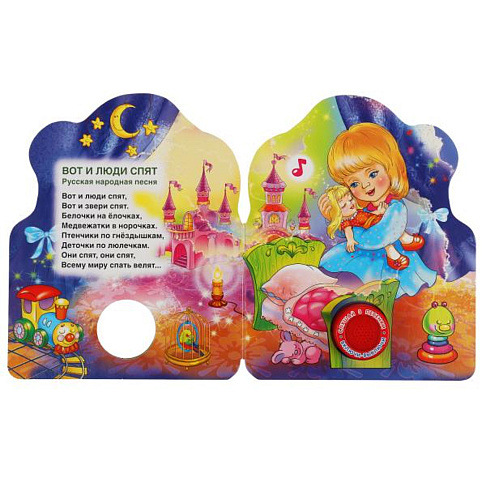 Ребёнок с удовольствием будет листать плотные страницы, рассматривать красочные картинки, читать вместе с родителями, а также нажимать на кнопку и слушать добрые колыбельные песенки. Малыш легко освоит включение звука: при нажатии на кнопку включится первая песенка, при втором нажатии выключится, в 3-ий раз - заиграет следующая и т.д. Благодаря компактному формату книгу удобно брать с собой в дорогу.