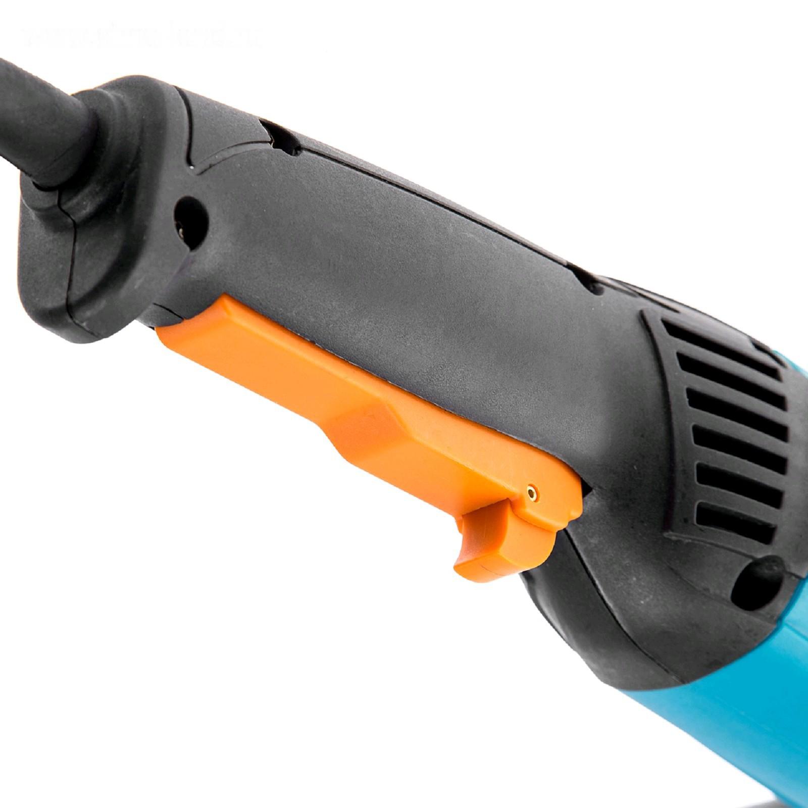 УШМ имеет регулировку скорости, что позволяет работать в различных условиях с разными материалами. Для удобной и быстрой замены диска установлена функция блокировки шпинделя. Также можно регулировать положение защитного кожуха без ключа.