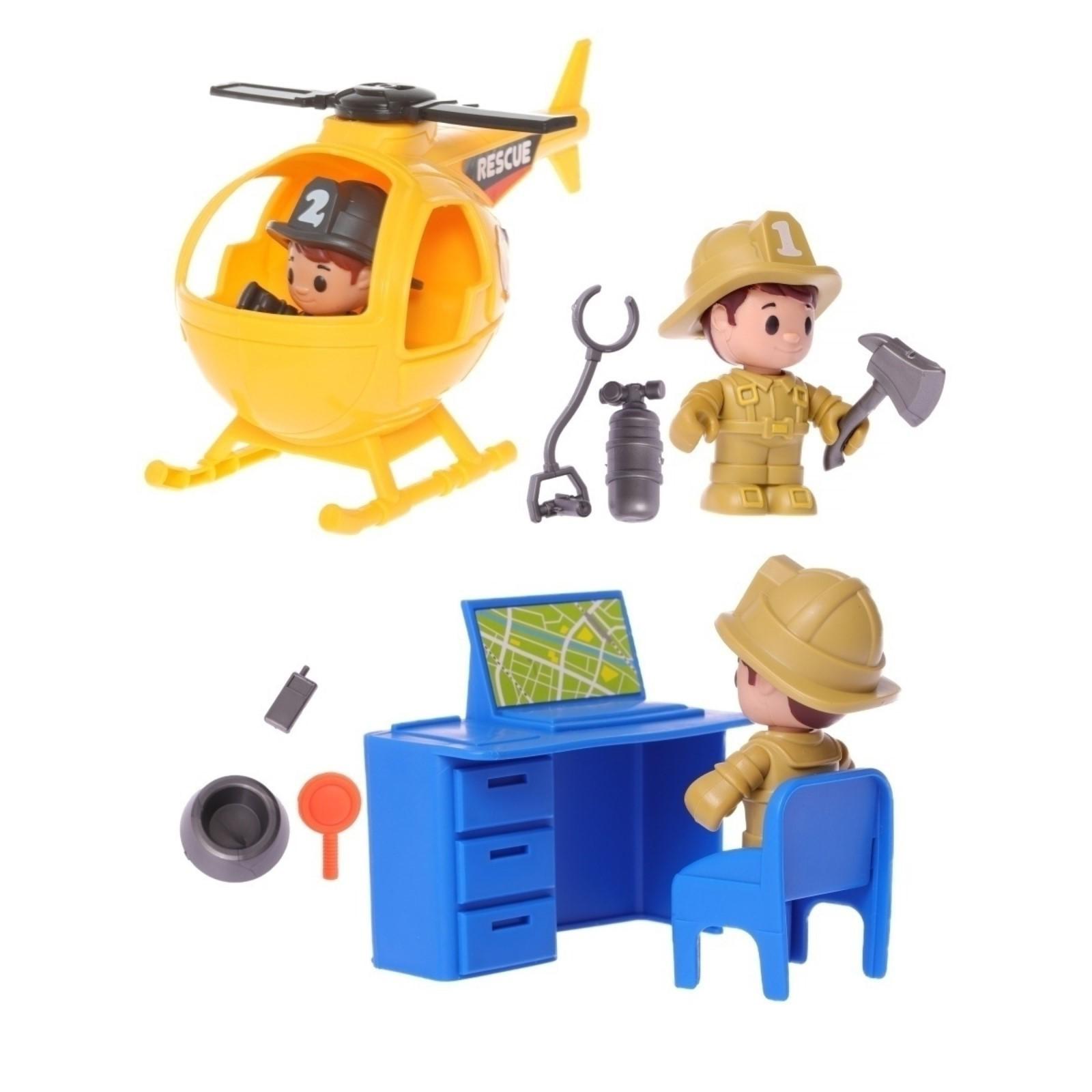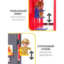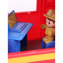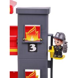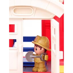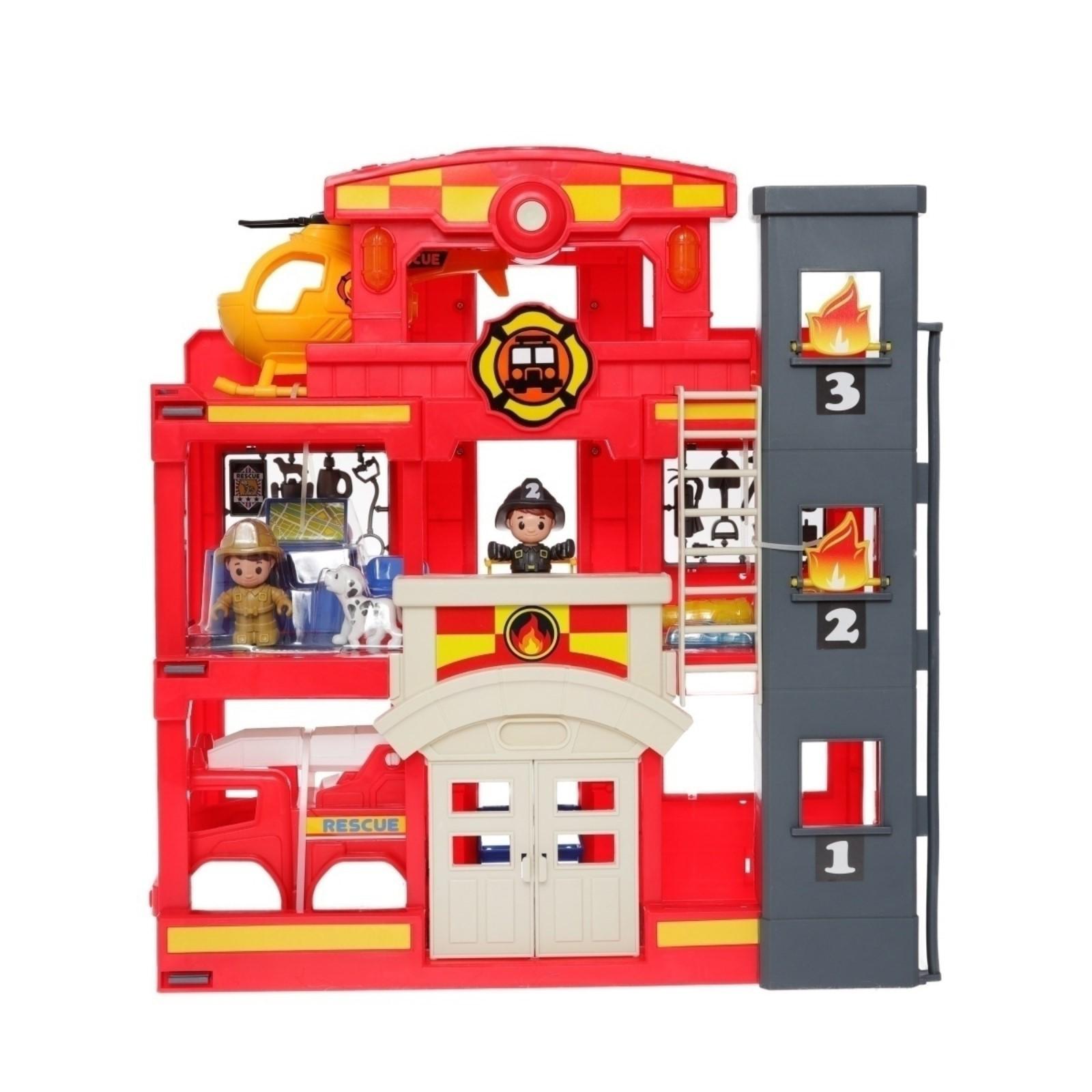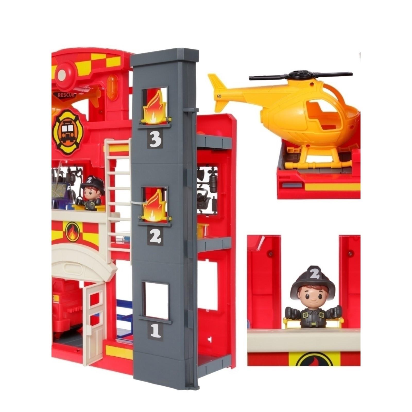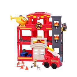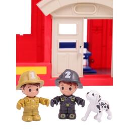 Игровой набор «Пожарная станция» представляет собой трехэтажное здание 43х42х13 см с 2 лифтами, приставной лестницей, с несколькими кабинетами, один из которых оборудован столом с монитором и креслом. На крыше станции вертолетная площадка и кнопка тревоги со звуковыми и световыми сигналами. В набор входят вертолет 16 см и пожарная машина 16 см с водяной пушкой, которая стреляет снарядами, имитирующими воду (3 снаряда в комплекте). В наборе также 2 фигурки пожарных по 7 см с двигающимися руками и головой и собака-поисковик. Дополнительные аксессуары, такие как огнетушитель, лопата, топор, захват и другие, позволяют сделать игру ещё более увлекательной.