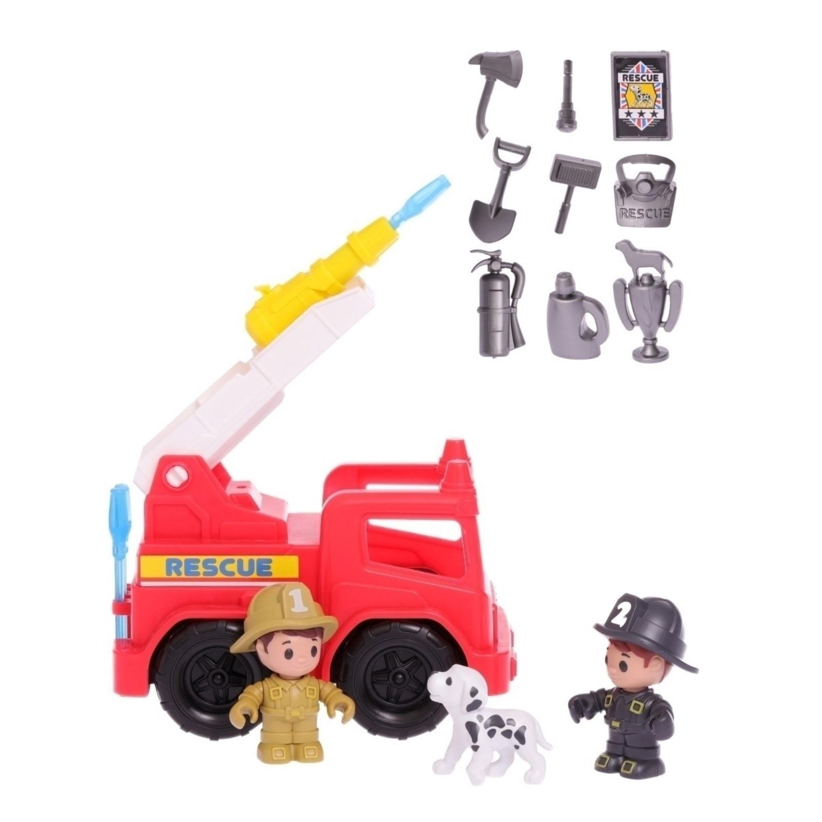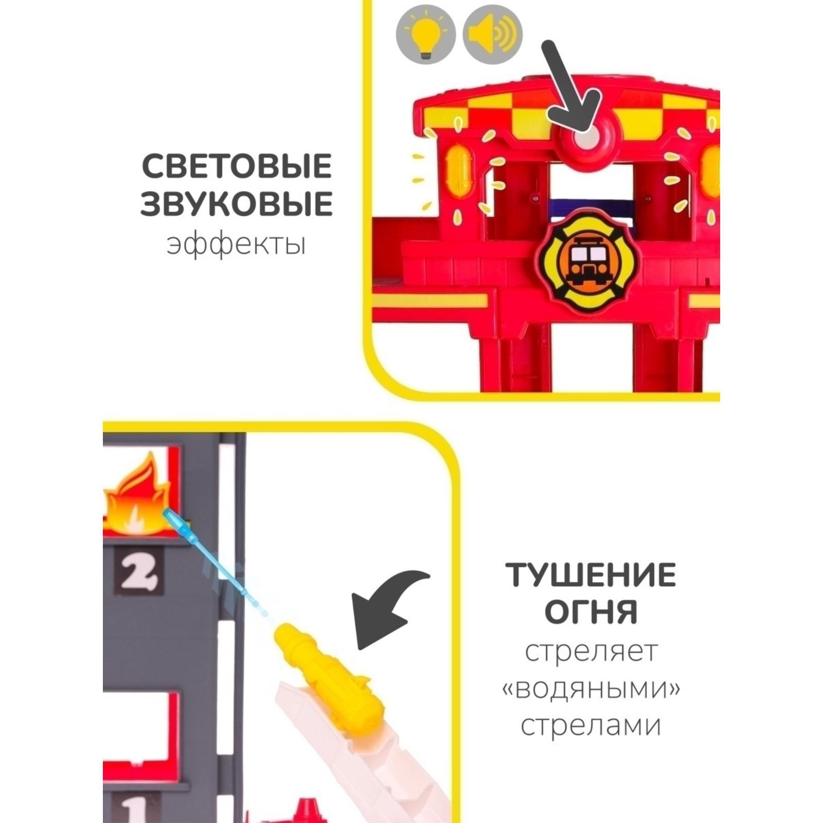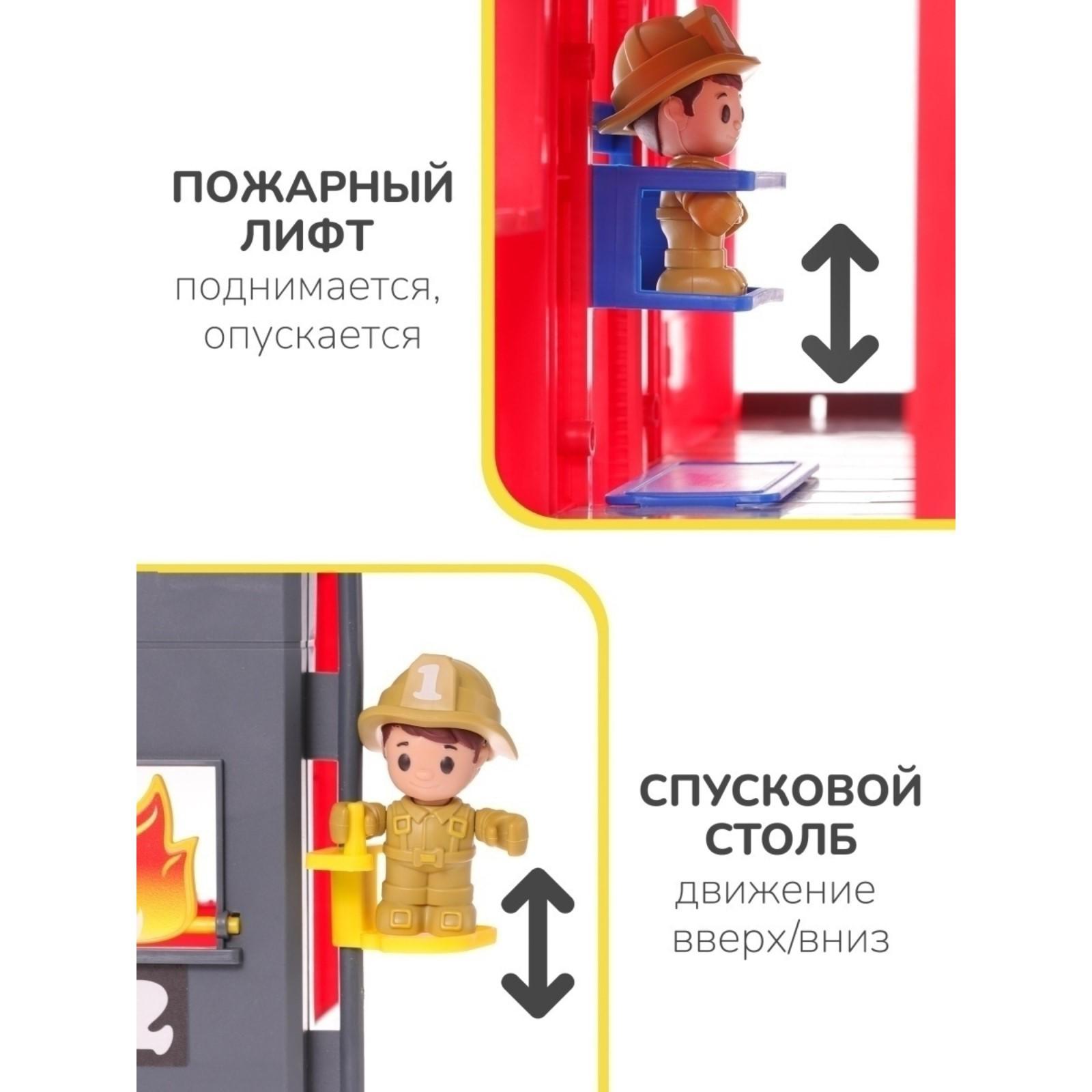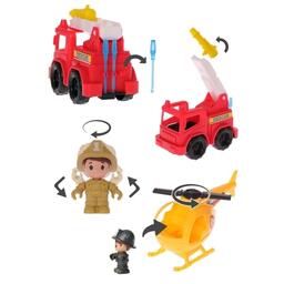 Игровой набор «Пожарная станция» представляет собой трехэтажное здание 43х42х13 см с 2 лифтами, приставной лестницей, с несколькими кабинетами, один из которых оборудован столом с монитором и креслом. На крыше станции вертолетная площадка и кнопка тревоги со звуковыми и световыми сигналами. В набор входят вертолет 16 см и пожарная машина 16 см с водяной пушкой, которая стреляет снарядами, имитирующими воду (3 снаряда в комплекте). В наборе также 2 фигурки пожарных по 7 см с двигающимися руками и головой и собака-поисковик. Дополнительные аксессуары, такие как огнетушитель, лопата, топор, захват и другие, позволяют сделать игру ещё более увлекательной.