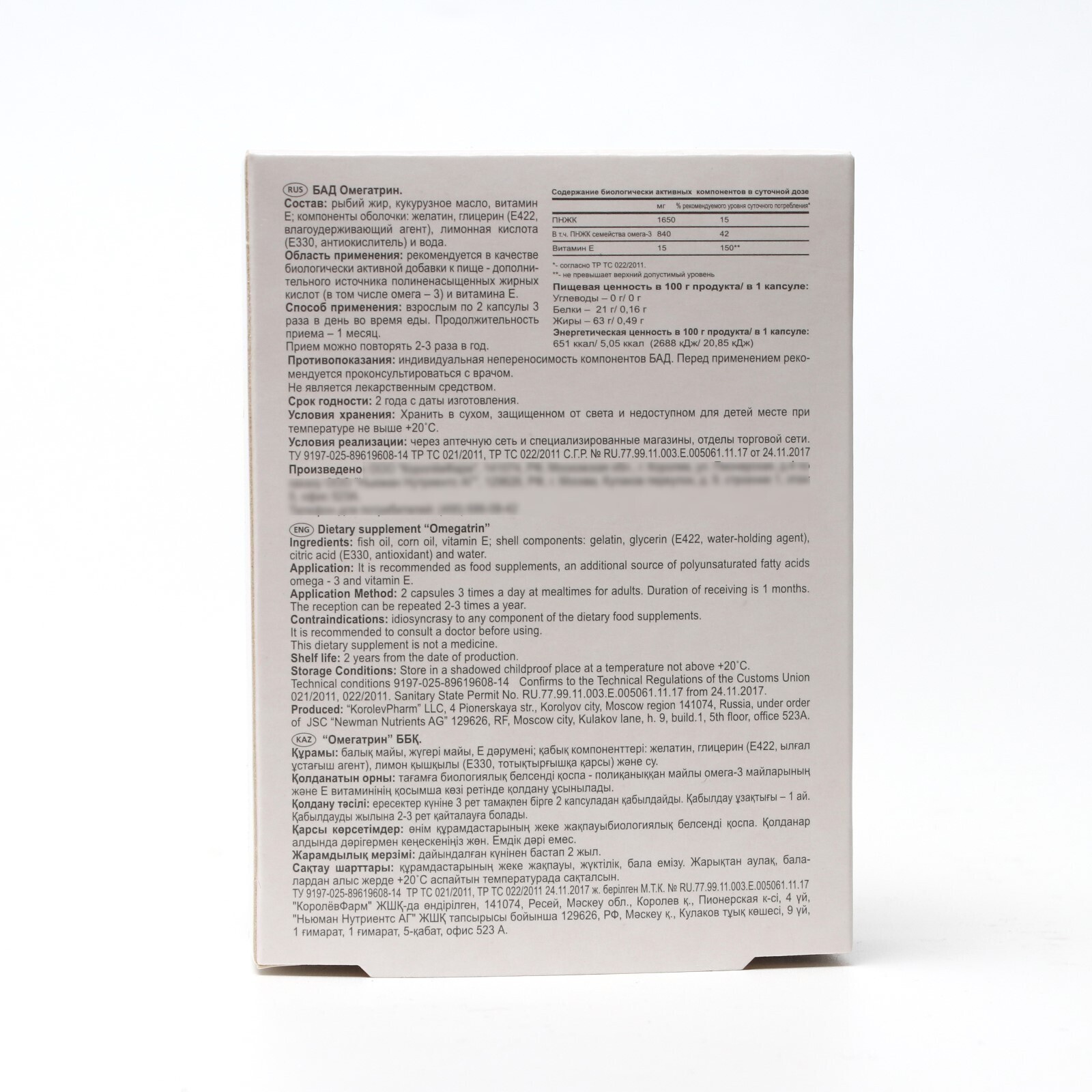 Состав: рыбий жир, кукурузное масло, витамин е, компоненты оболочки, желатин, глицерин (е422, влагоудерживающий агент), лимонная кислота (е330, антиокислитель) и вода.