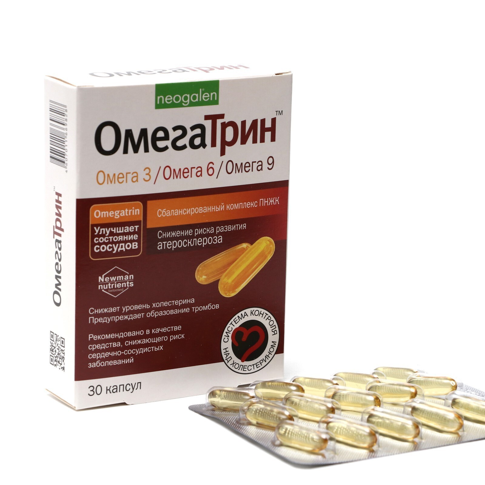 Капсулы Омегатрин сбалансированный комплекс ПНЖК. Способствует снижению развития атеросклероза. Снижает уровень холестерина, предупреждает образование тромбов. Рекомендовано в качестве средства, снижающего риск сердечно-сосудистых заболеваний. Применяется в качестве биологически активной добавки к пище – дополнительного источника полиненасыщенных жирных кислот (в том числе омега -3) и витамина Е.