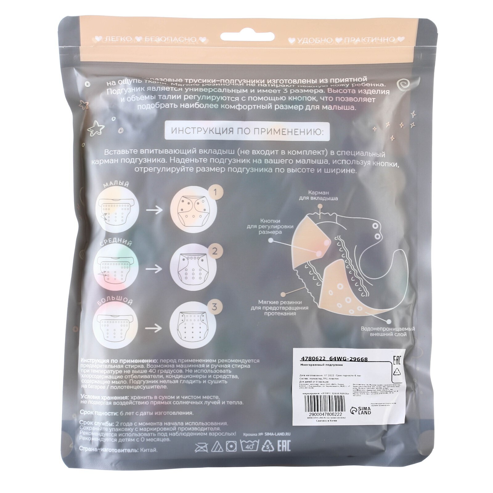 • Подгузник имеет удобный кармашек для вкладыша;