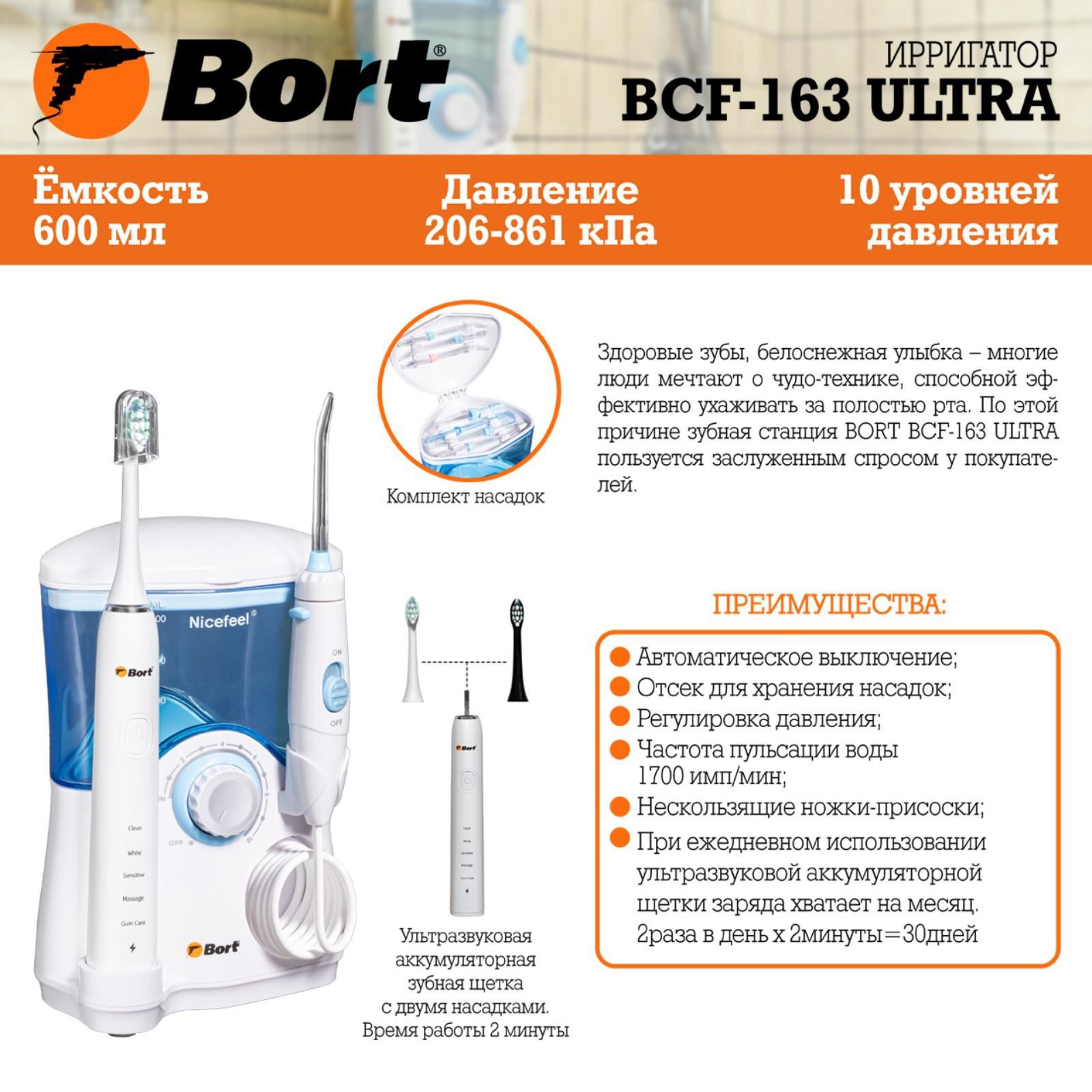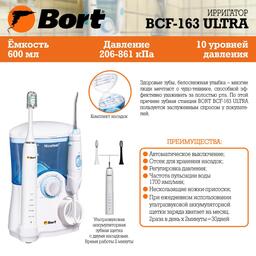 Ирригатор Bort BCF-163 ULTRA, стационарный, 600 мл, 10 режимов, 7 насадок, от сети, белый