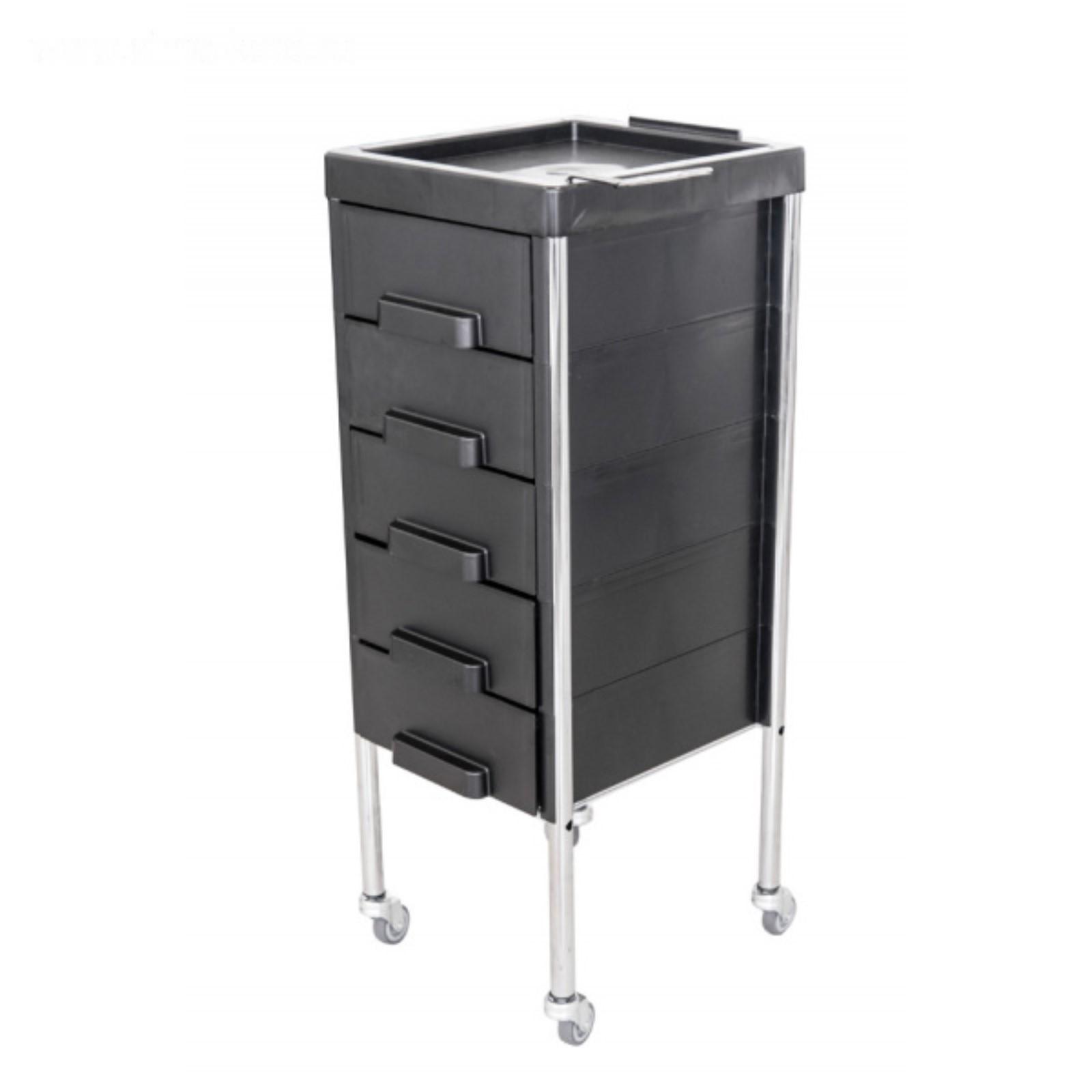 Компактная тележка на колесах, отличающаяся стильным дизайном и хорошей вместительностью. Тележка выполнена из первичного ударопрочного пластика на металлическом хромированном каркасе. Имеется рабочая поверхность с бортиками. Закрытые боковины тележки защищают ящики от попадания в них пыли.
