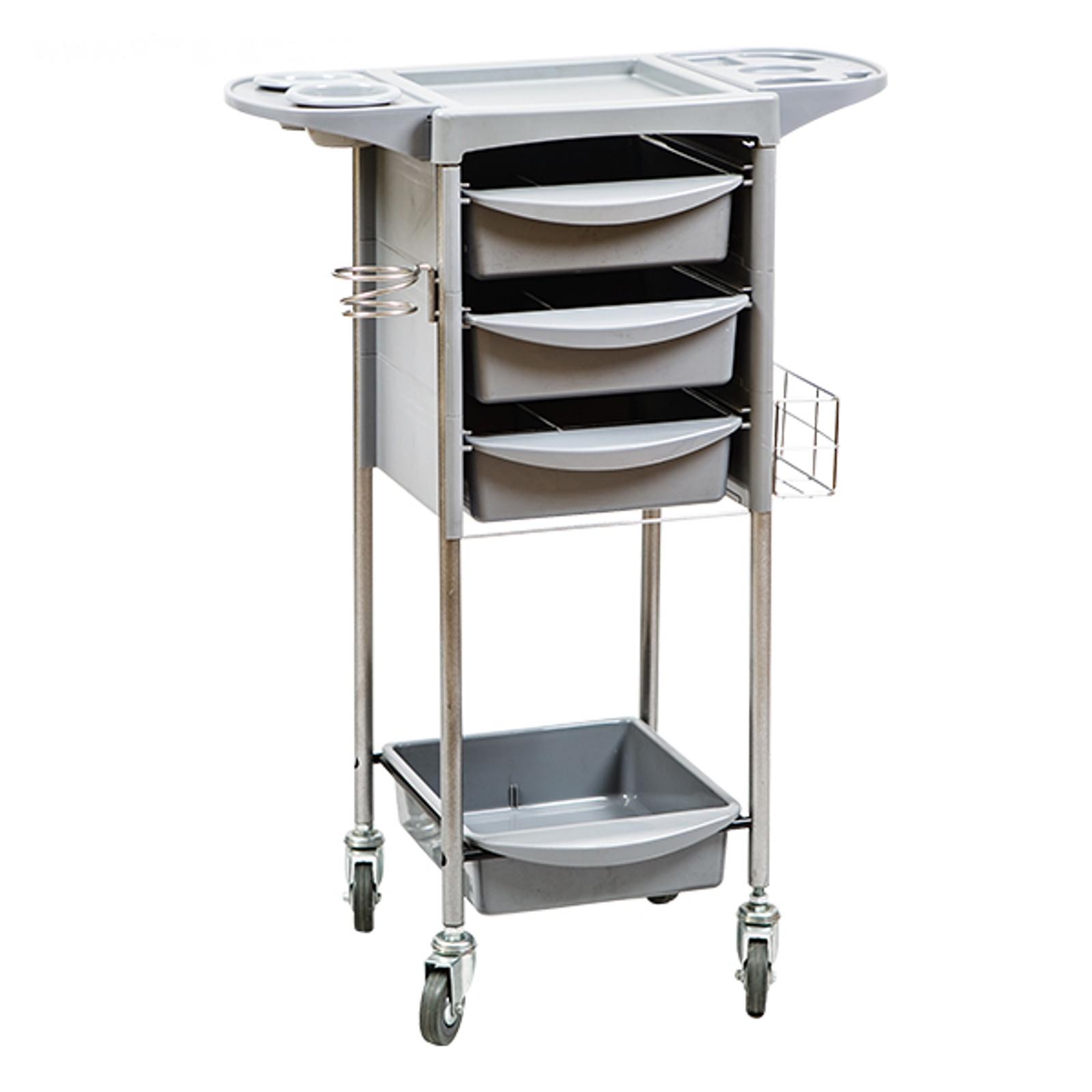 Парикмахерская тележка SD-3016A с навесными панелями, металлическим держателем фена и съёмной нижней корзиной. Каркас тележки выполнен из хромированного металла, ящики и навесные элементы – из ударопрочного пластика. Конструкция установлена на больших свободно вращающихся колесах.