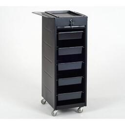 Парикмахерская тележка изготовлена из металла и прочного пластика. В конструкции предусмотрено пять вместительных ящиков, запирающихся на ключ. Столешница оборудована держателем инструментов, на рабочей поверхности также можно закрепить любой из ящиков. Тележка оснащена бесшумными прорезиненными колесами.