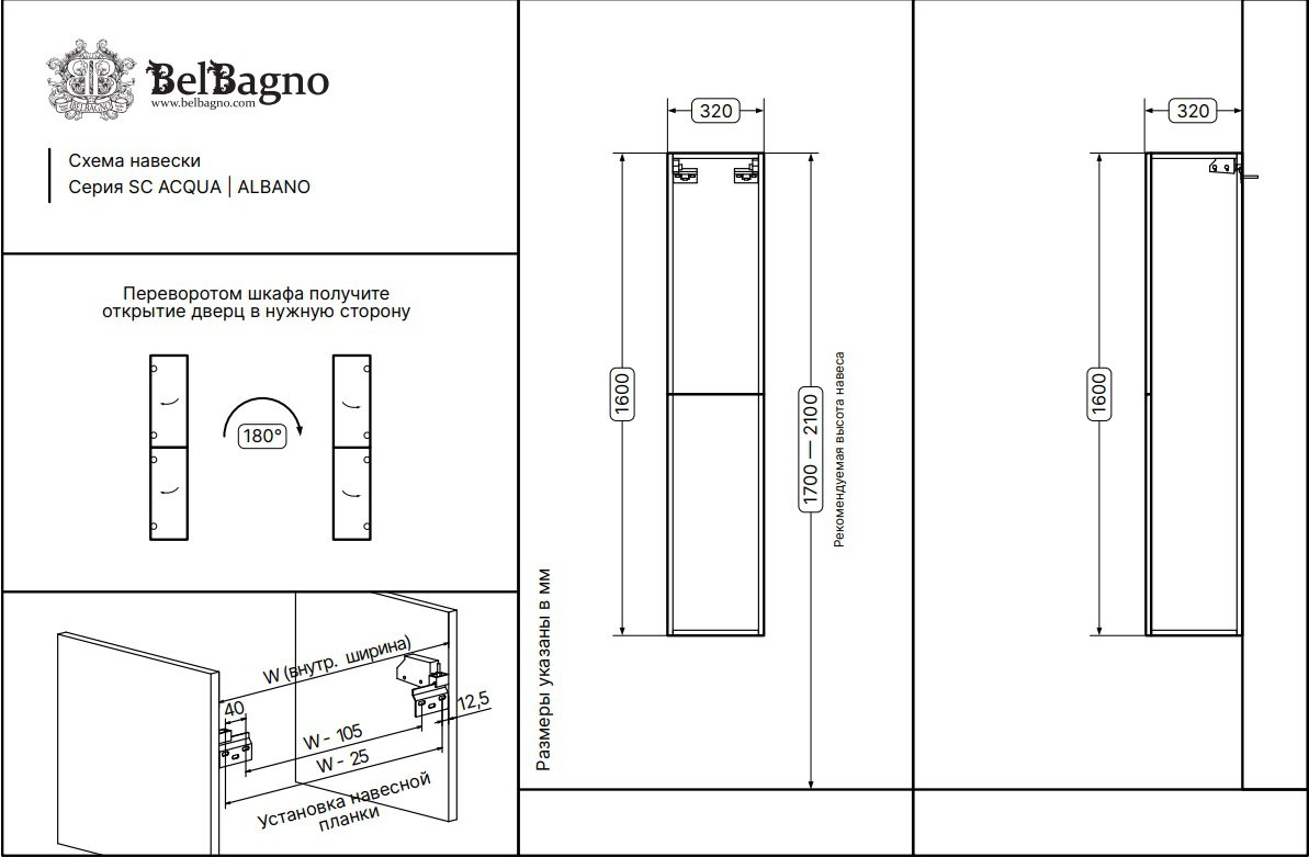 шкаф-пенал подвесной belbagno acqua-1600-2a-sc-ps-p