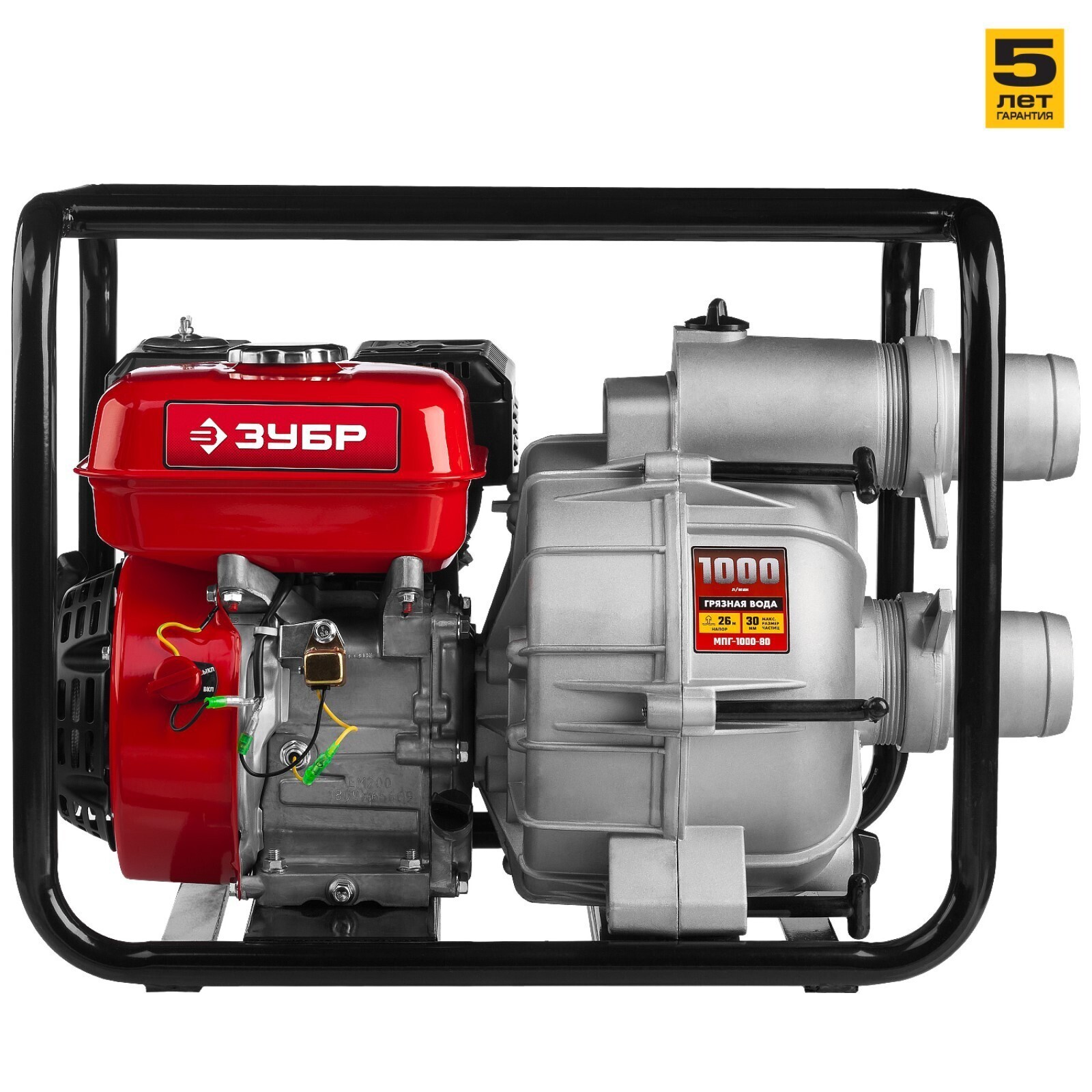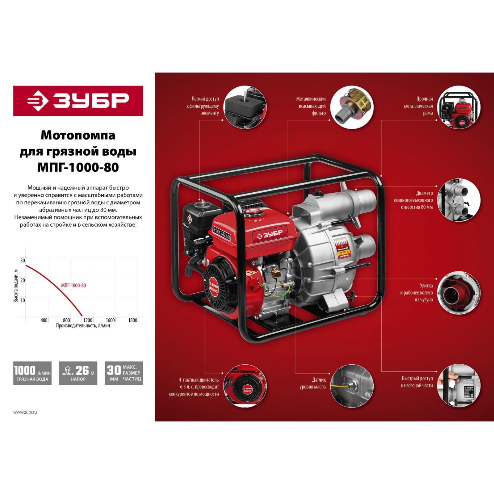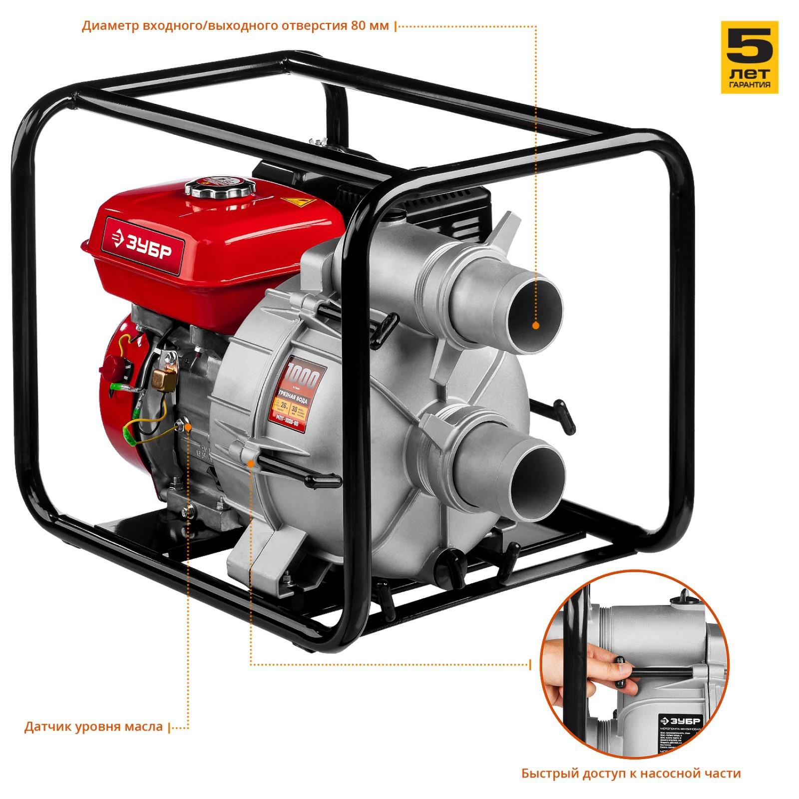 Мотопомпа для грязной воды ЗУБР МПГ-1000-80, 4Т, 4.8 кВт, 1000 л/мин, d=80 мм, подъем 26 м