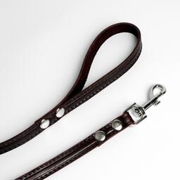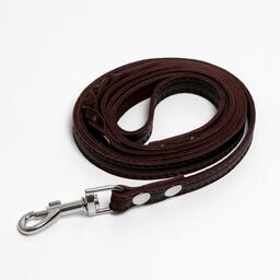 Поводок изготовлен из полосы кожи, прочный и эластичный. Для захвата предусмотрена удобная петля. Чтобы пристегнуть поводок к ошейнику, предусмотрен надежный карабин.