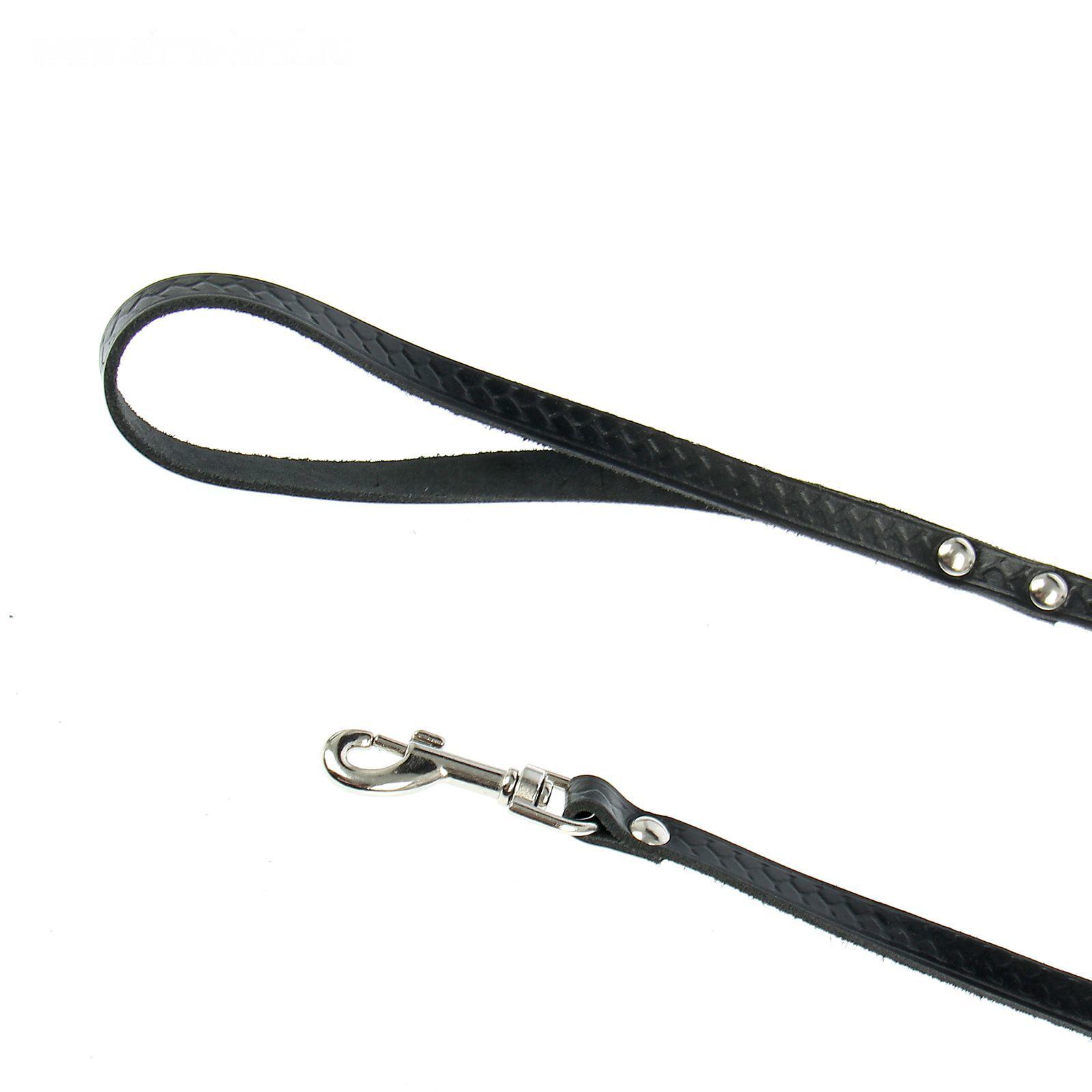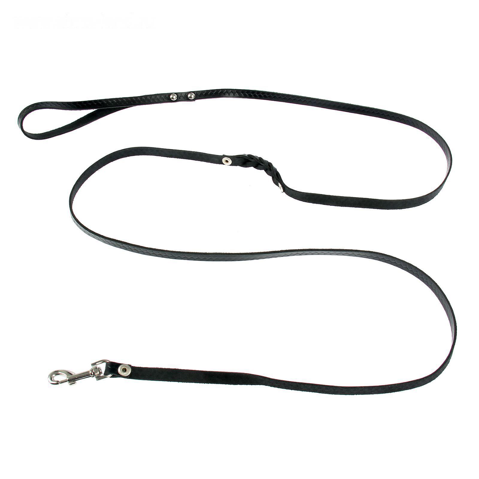 Поводок изготовлен из полосы кожи, прочный и эластичный. Для захвата предусмотрена удобная петля. Чтобы пристегнуть поводок к ошейнику, предусмотрен надежный карабин.