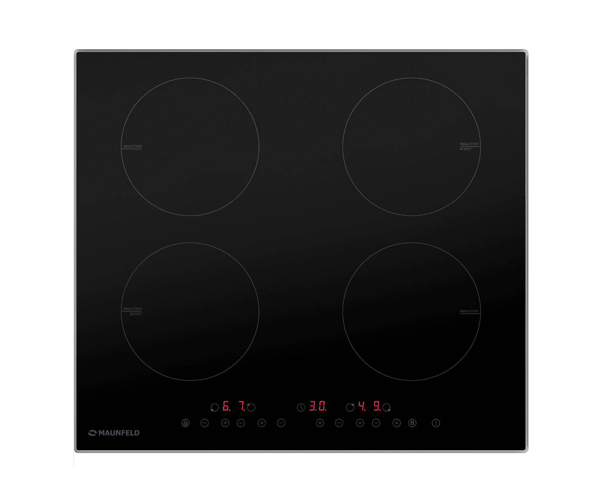 Классическая индукционная варочная панель шириной 60 см выполнена из жаропрочного износостойкого стекла (стеклокерамики) черного цвета. Имеет элегантную металлическую окантовку по периметру, которая служит для защиты от сколов на торцах и не дает жидкости, убежавшей при готовке, попасть на столешницу.