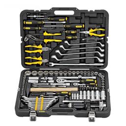 Универсальный набор пригодится каждому мужчине. Комплект из 131 различных предметов помещён в кейс, что позволит вам легко и с удобством транспортировать инструменты.
