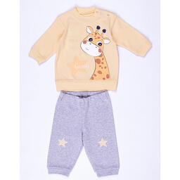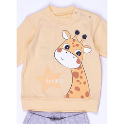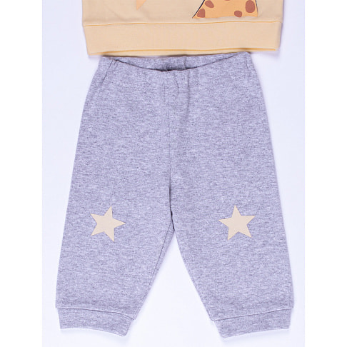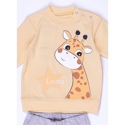 Удобный комплект из кофточки и брючек для девочки. Кофточка украшена забавным принтом в виде жирафа по центру, застегивается на удобные кнопочки на плече. Штанишки меланж с небольшим принтом на коленях и мягкой широкой резиночке на поясе. Комплект выполнен из неаллергенного материала, приятный на ощупь, не вызывает дискомфорт.