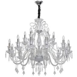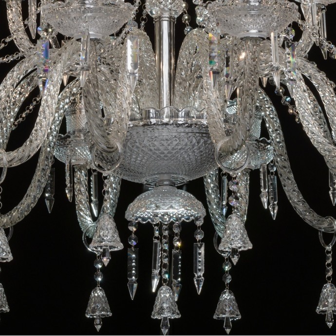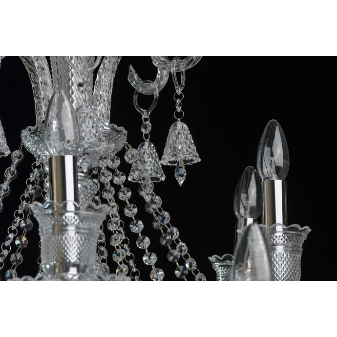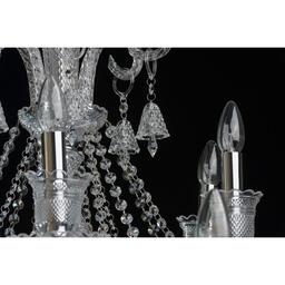 Металлическое основание гальванизировано в цвет хрома и декорировано прозрачным хрустальным стеклом грановитой огранки. Розетки и декор центральной оси отлиты в сложную форму. Витые рожки произведены гутным способом. Светильник декорирован прозрачным хрусталем оригинальной формы и огранки.