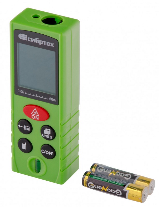 Лазерный дальномер Сибртех РМ-60 может определять длину, объем и площадь помещения. Он применяется при проведении строительных и отделочных работ: укладке плитки, установке окон, дверей, напольных покрытий, натяжных потолков. Высокая дальность измерения до 60 м позволяет работать на улице, поэтому дальномер пригодится геодезистам и дорожным службам.Преимущества: За счет встроенной опции Пифагора дальномер может вычислять расстояние даже при наличии препятствий на пути луча. Результаты последних 20 замеров сохраняются в памяти дальномера для удобства работы. Если нужно работать в движении, то поможет опция непрерывных измерений. Прибор делает замеры каждую секунду, пока нужное расстояние не будет найдено. Функция складывания и вычитания позволяет производить расчеты без калькулятора. Высокую точность измерения обеспечивает пузырьковый уровень, с помощью которого дальномер можно выровнять на поверхности. Корпус выполнен из ABS-пластика, это повышает его прочность. Ав