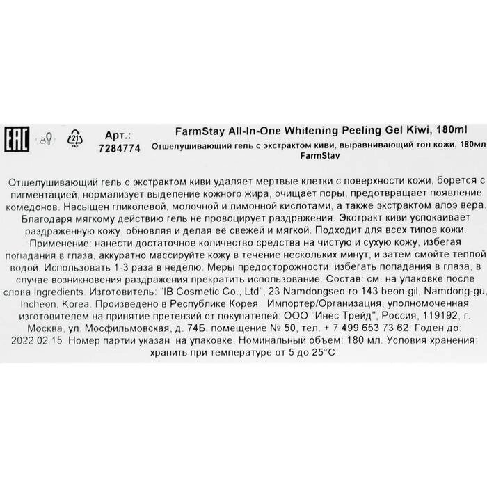 Пилинг-скатка для лица FarmStay, с экстрактом киви, 180 мл