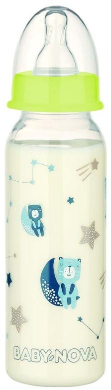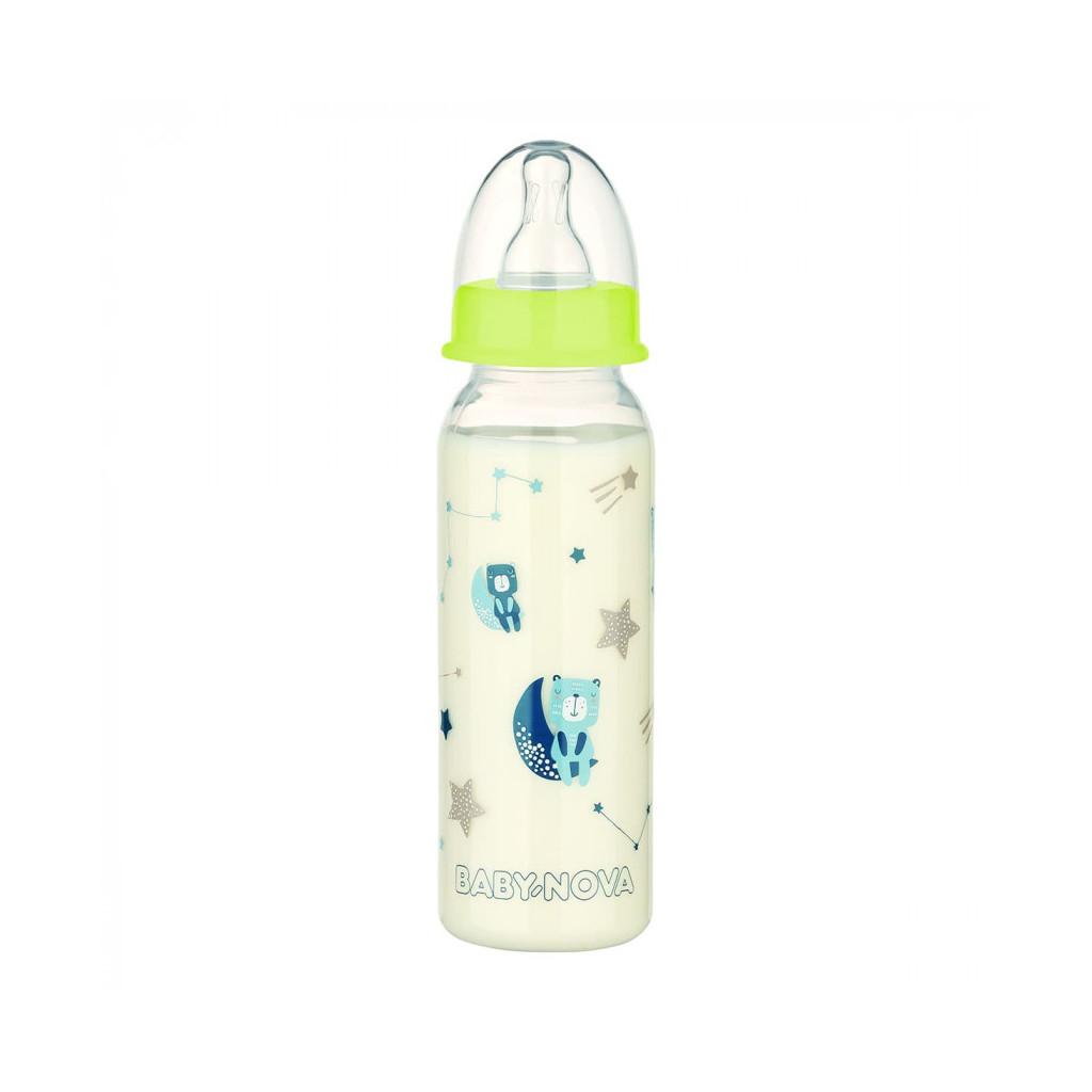 Пляшечка Baby-Nova 240 мл виготовлена з безпечного матеріалу і забезпечена круглою силіконовою соскою розміру М-средний потік. Гвинтове кільце світиться в темряві, тому пляшку зручно використовувати вночі.
