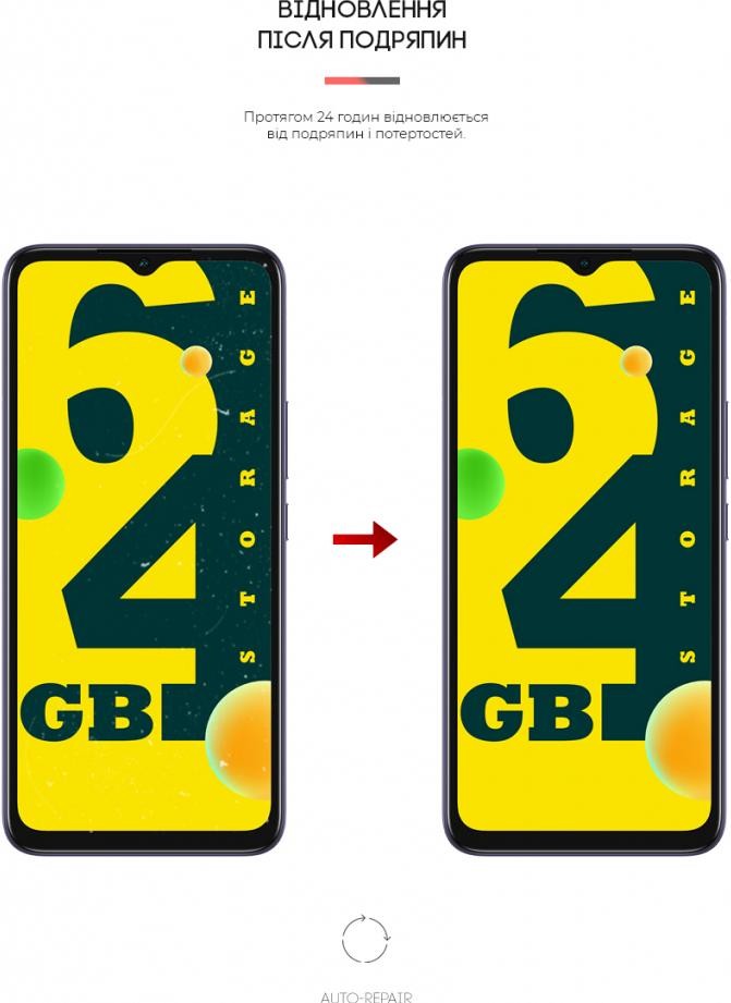 Властивість Auto-Repair — завдяки використанню гідрогелю, плівка відновлюється від косметичних подряпин і потертостей упродовж 24 годин.