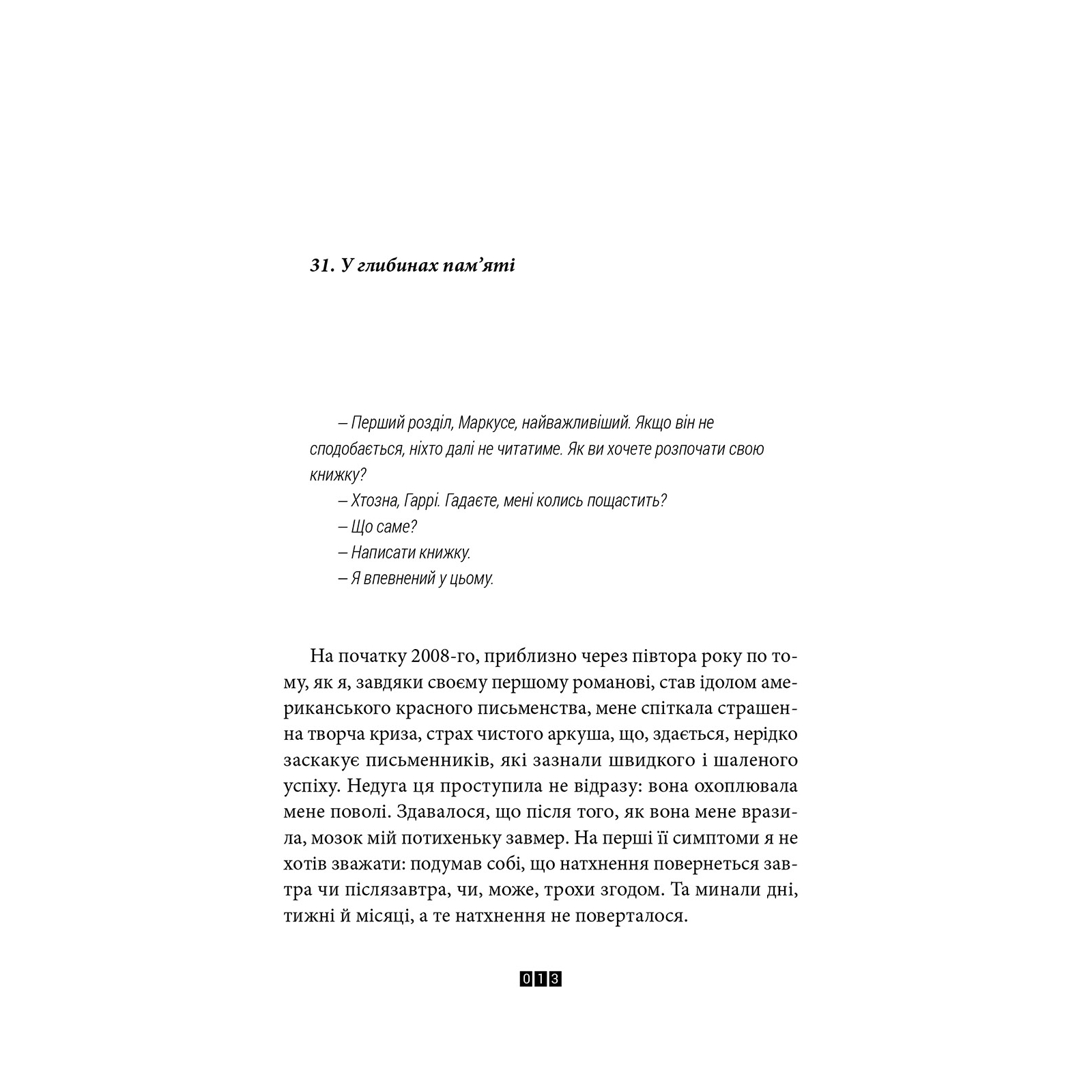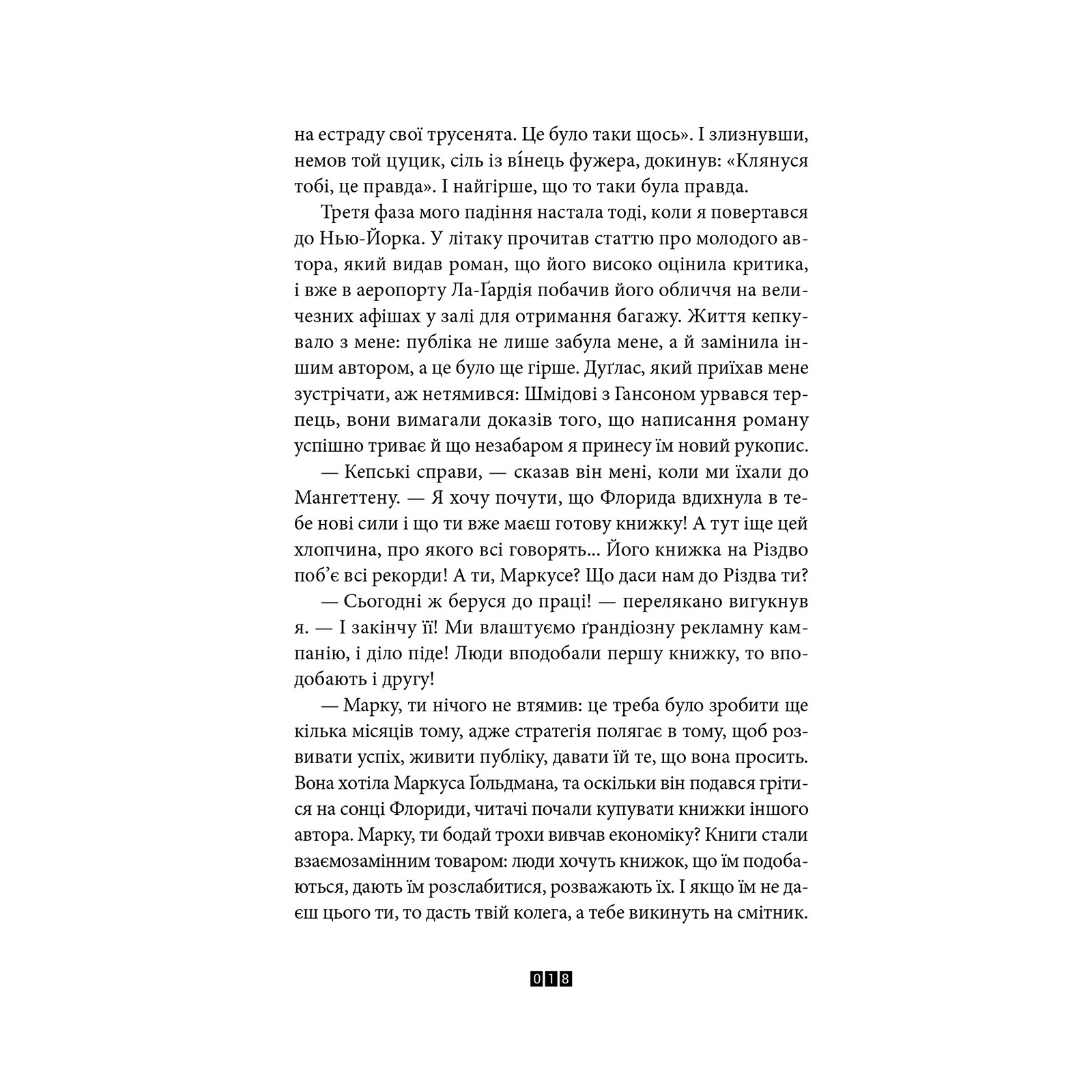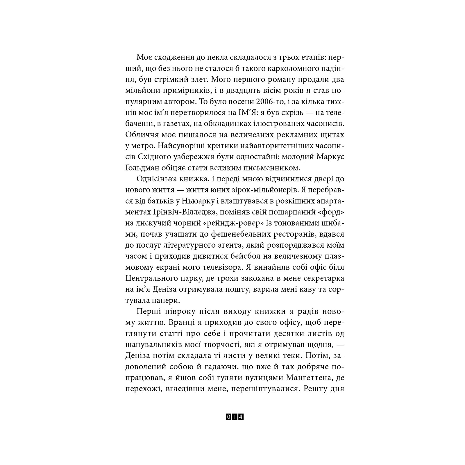 Молодий письменник Маркус Гольдман дебютував зі своїм першим романом так гучно, що здається – світова слава біля його ніг. Щоправда, друга книжка ніяк не напишеться, а вдячні читачі от-от оберуть нового кумира. Маркус звертається по допомогу до свого наставника — одного з найвідоміших авторів сучасності Гаррі Квеберта. Та крім цінних порад, як подолати страх чистого аркуша та написати бестселер, отримує від нього ще й кримінальну справу. Квеберта звинувачують у вбивстві 33-річної давності. Щоб допомогти йому та написати про це нову книжку, Маркус береться розслідувати справу. І виявляється, що правда про Гаррі Квеберта буває не одна. І кожного разу, коли здається, що всі пазли складено, винних знайдено, а мотив очевидний, варто лише перегорнути сторінку — і з’являється новий факт, який переверне все дороги дригом.