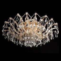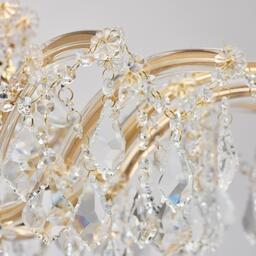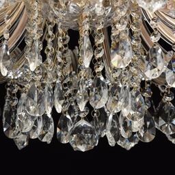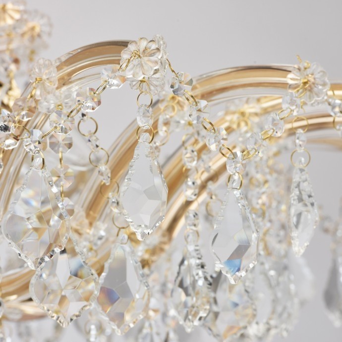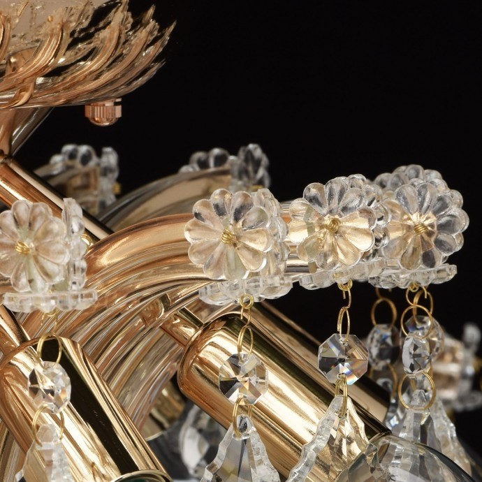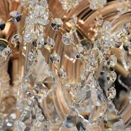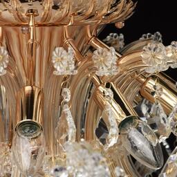 Арматура выполнена из сплава металла, с последующей гальванизацией в цвет французского золота. Рожки декорированы рифленным прозрачным стеклом, отлитым по форме рожков. Светильник декорирован подвесами из прозрачного хрусталя сложной огранки.