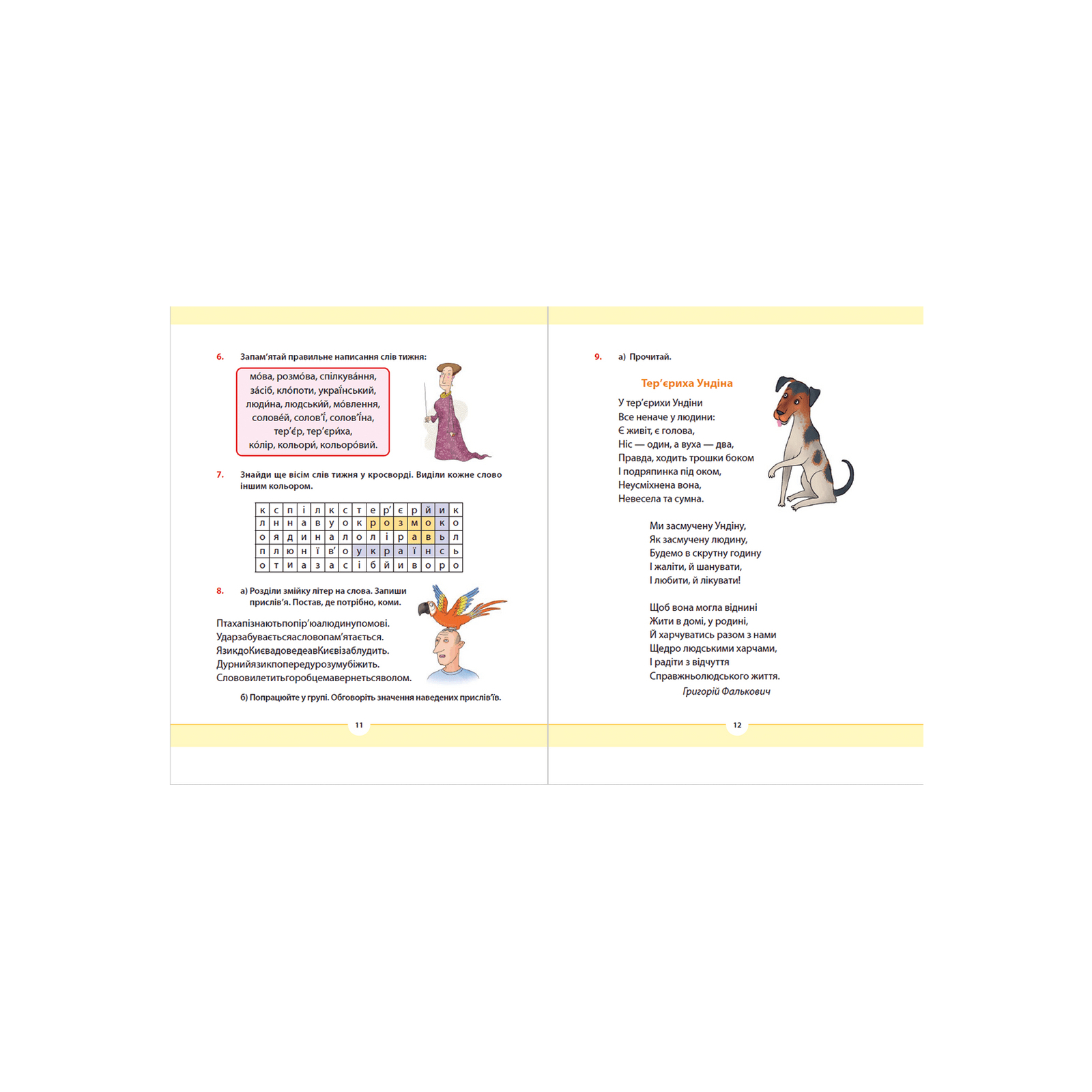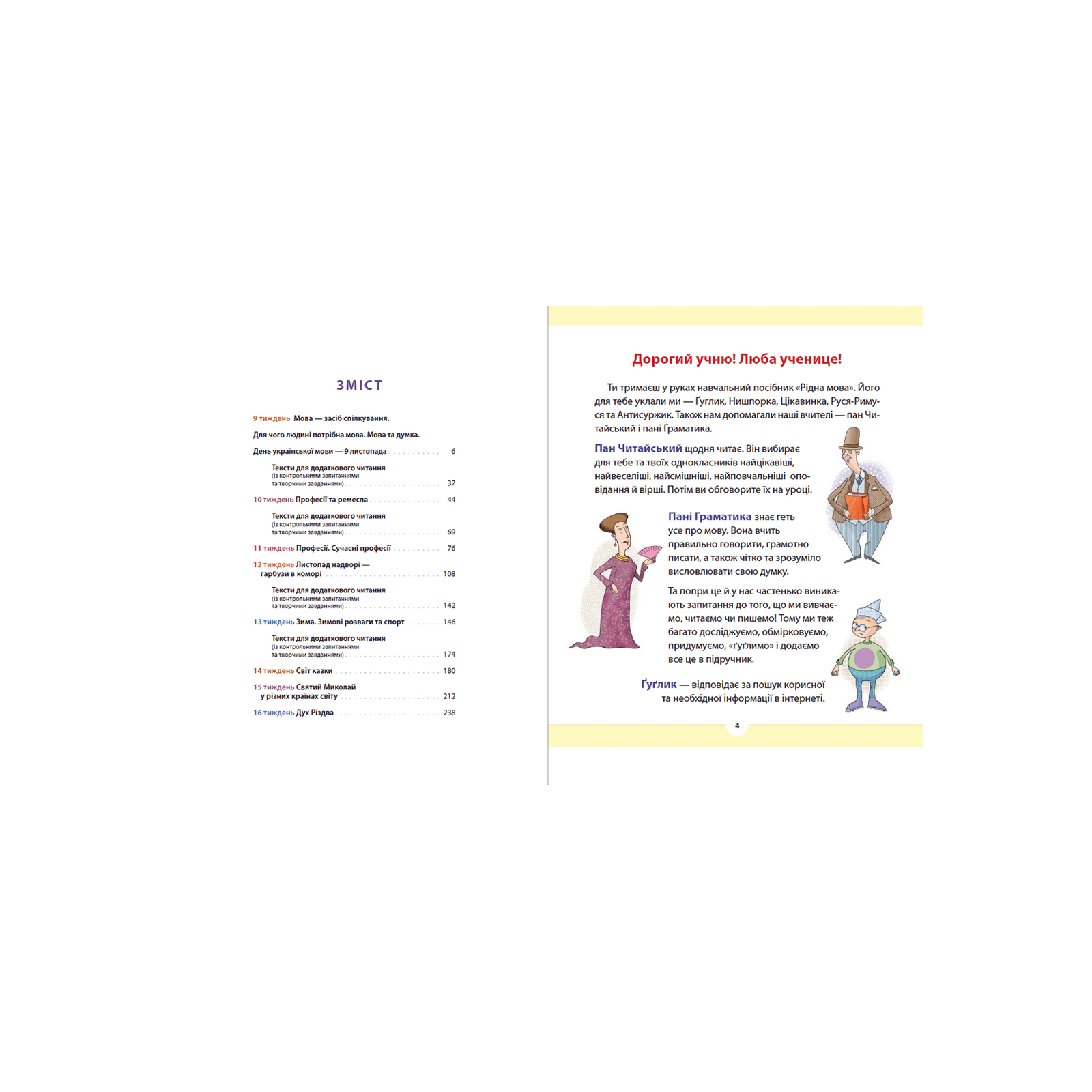 На сторінках навчального посібника ви зустрінете цікавих героїв, які допоможуть опанувати нові інтегровані уроки української мови та літератури. З ними щодня читатимете твори сучасних авторів та класиків дитячої літератури, аналізуватимете прочитане та навчитеся висловлювати власну думку і дбати про чистоту мови, а ще — дізнаєтеся безліч нових слів та іншого цікавого з предмету «Рідна мова». На вас чекають усні й письмові вправи, творчі та логічні завдання, а наприкінці кожного навчального тижня — контрольні запитання та завдання для засвоєння знань.