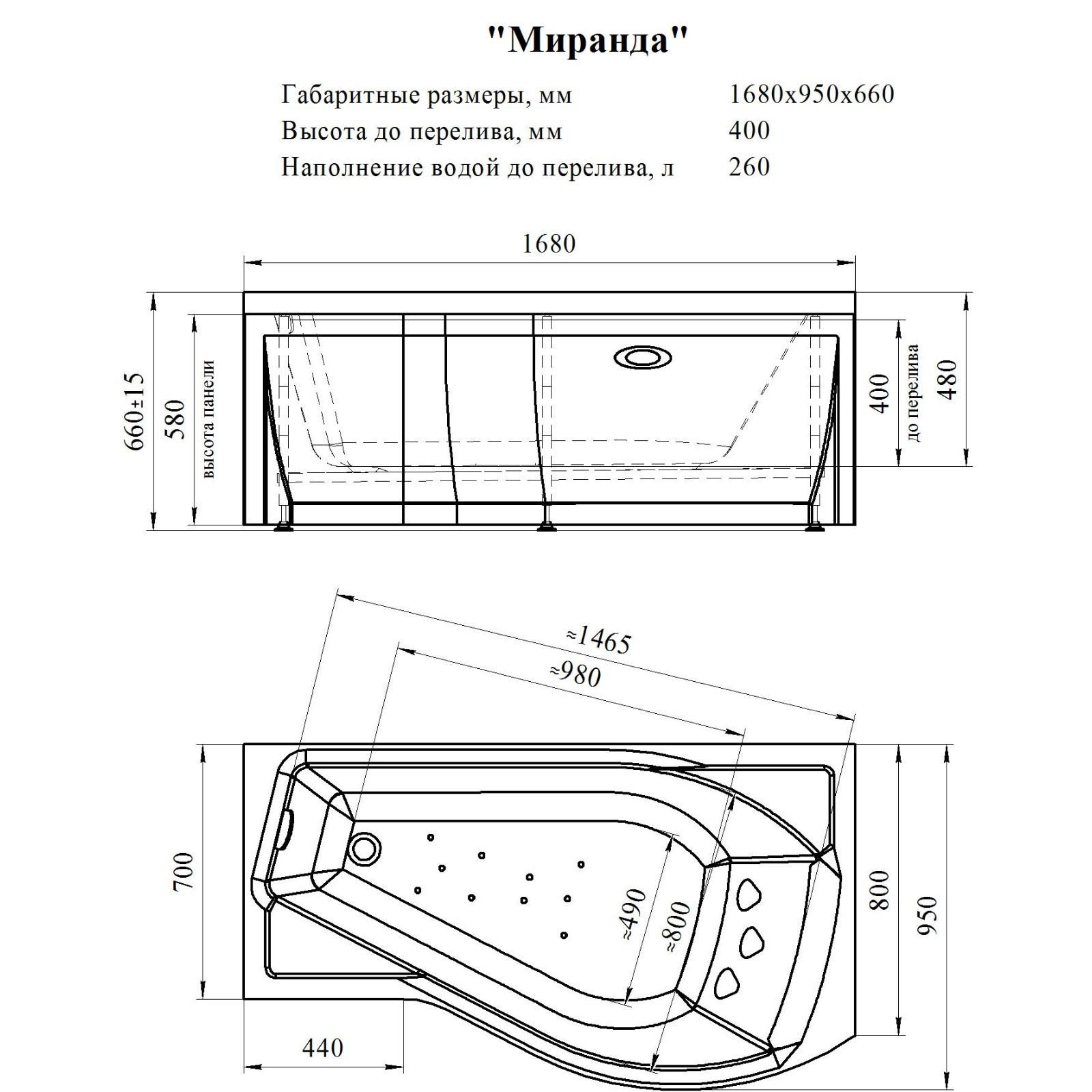 Ванна акриловая Vannesa 2-01-0-2-1-209Ч "Миранда", 168 х 95 см, без каркаса, правая