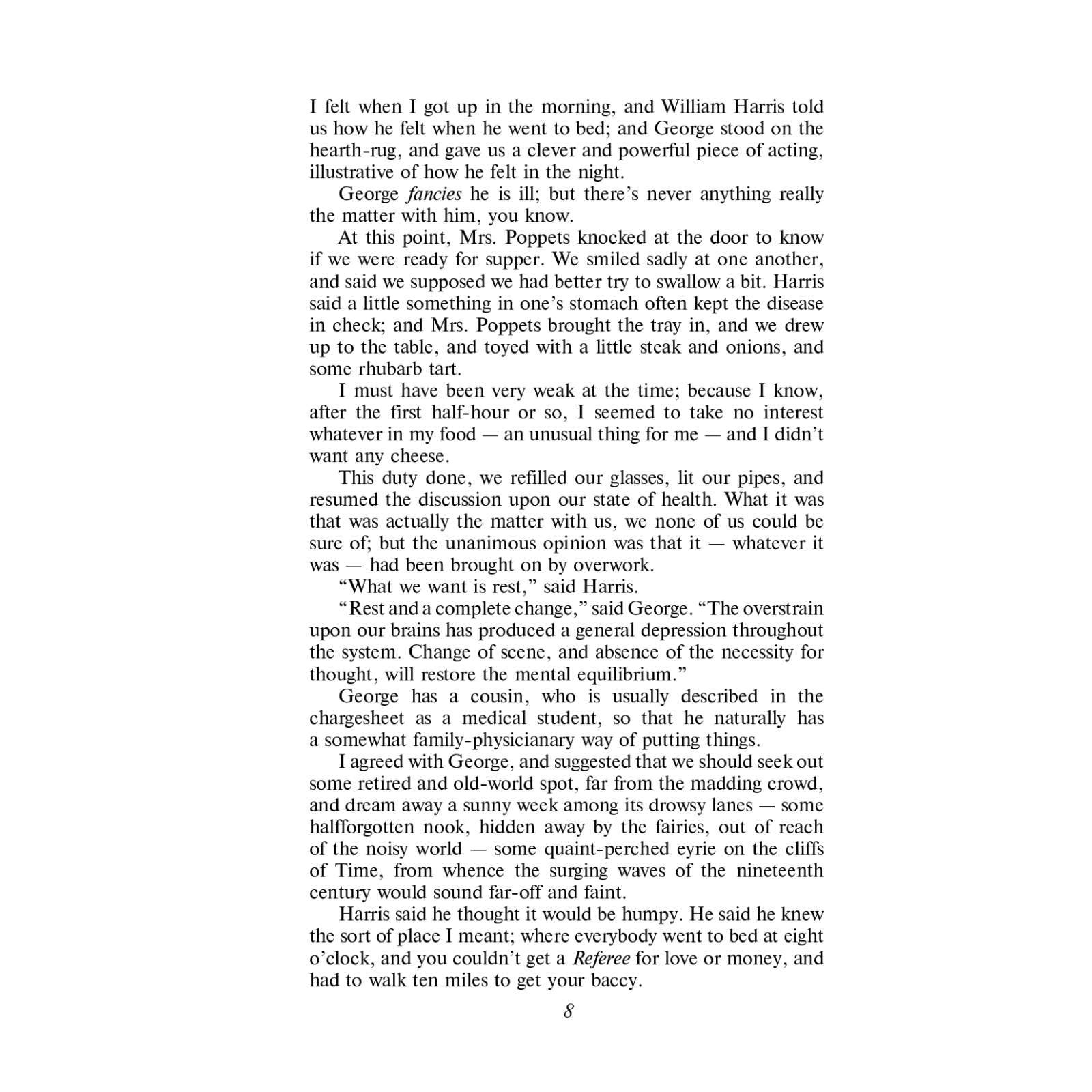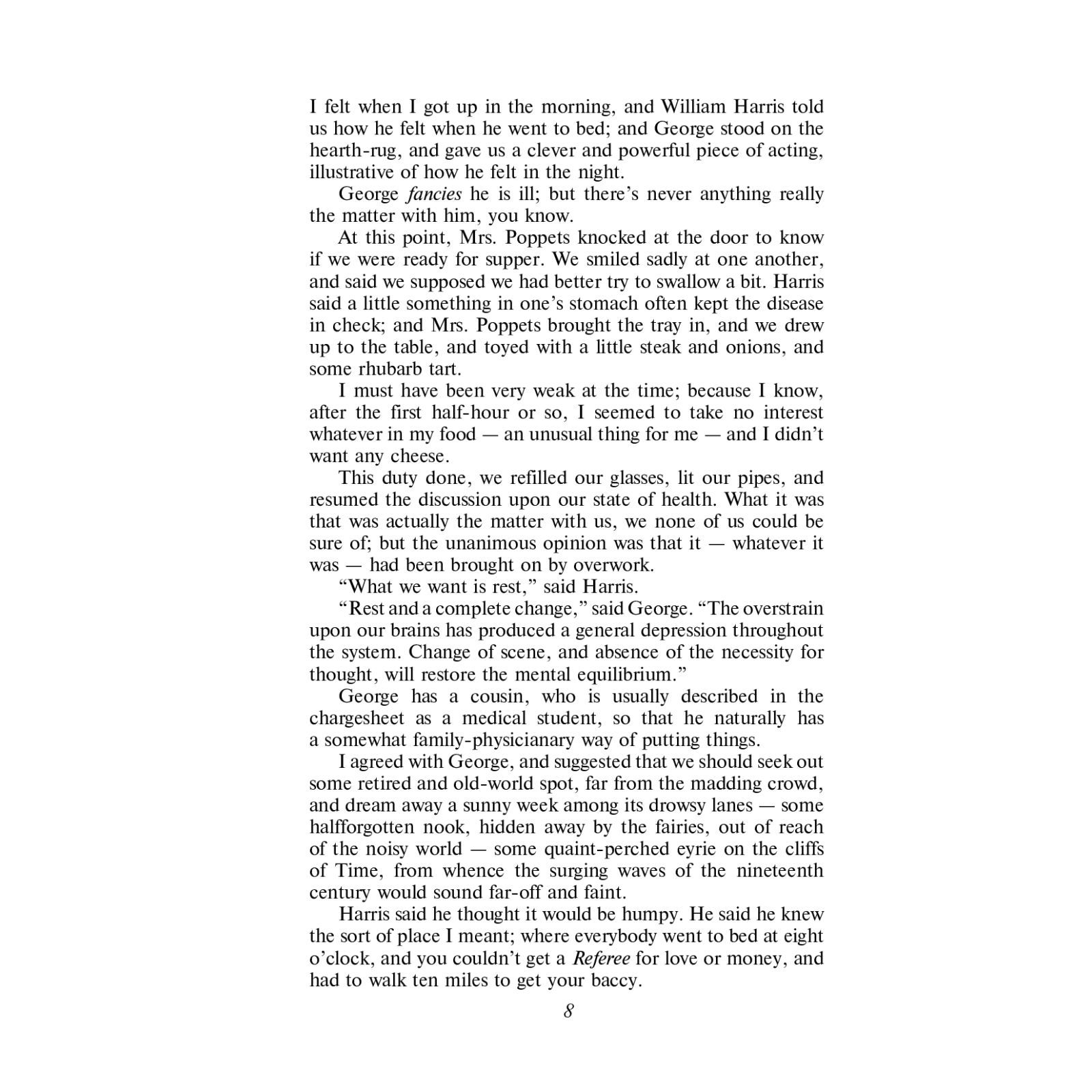 Jerome K. Jerome (1859—1927) was an English humorist. The situations he portrayed from the lives of ordinary Englishmen in his work «Three Men in a Boat (To Say Nothing of the Dog)» are still witty. Any minor thing — from packing to trying to open a can with food — can cause a number of adventures.