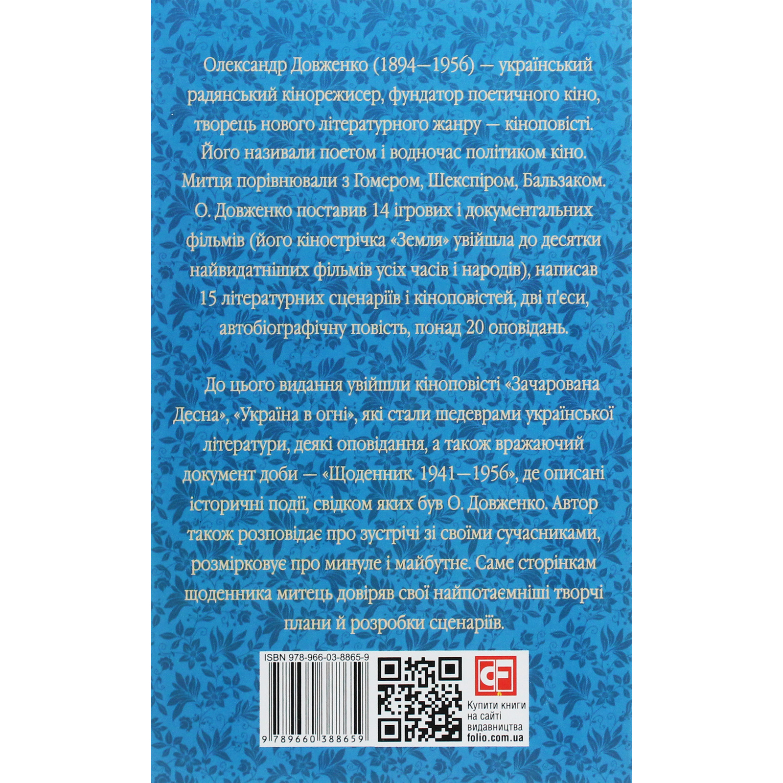 До цього видання увійшли кіноповісті «Зачарована Десна», «Україна в огні», які стали шедеврами української літератури, деякі оповідання, а також вражаючий документ доби — «Щоденник. 1941—1956», де описані історичні події, свідком яких був О. Довженко. Автор також розповідає про зустрічі зі своїми сучасниками, розмірковує про минуле і майбутнє. Саме сторінкам щоденника митець довіряв свої найпотаємніші творчі плани й розробки сценаріїв.
