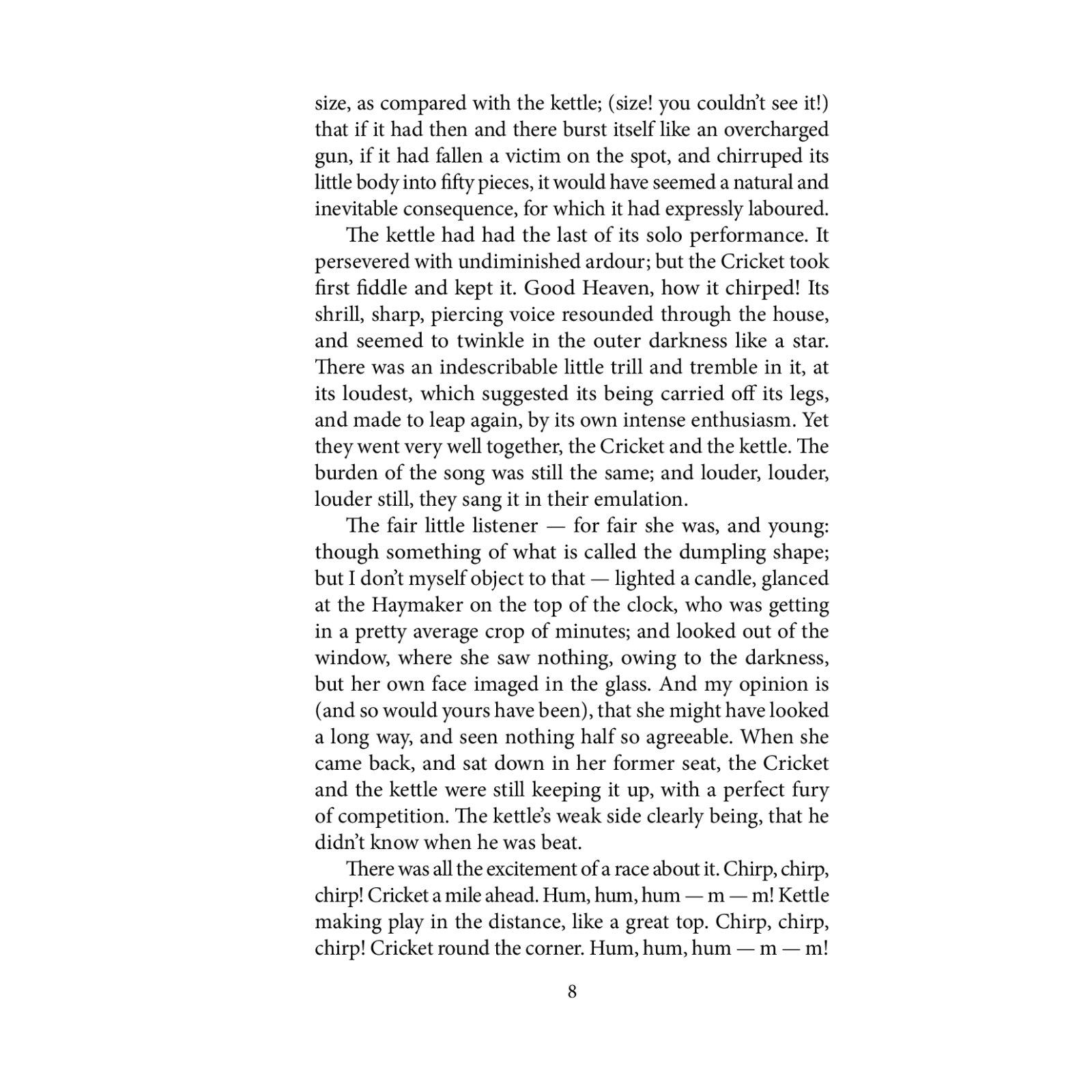 The novel «The Cricket of the Hearth» by the English writer Charles Dickens (1812—1870) belongs to the series of «Christmas stories». This is a story about a happy driver’s family. Dramatic events caused by the appearance of a stranger threaten the happiness of the family. However, magical creatures come to the rescue and the spirit of Christmas wins.