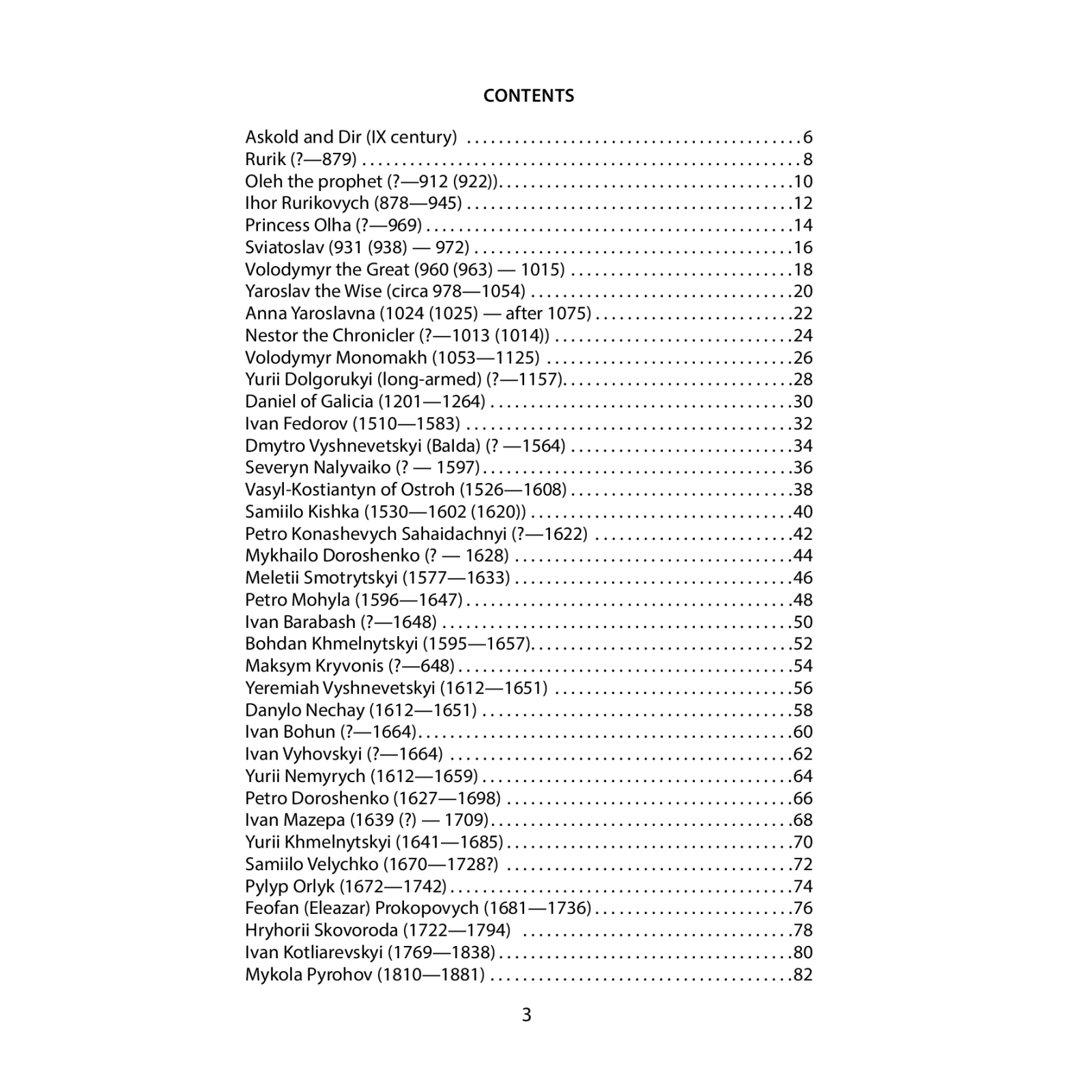 This edition does not in any way pretend to tell you about all the prominent Ukrainians — rulers and poets, warriors and actors, politicians and scientists — those who throughout centuries have been glorifying our country, building its statehood foundations, developing its language, culture and science. This is that intangible which makes us all feel as the citizens of our own country. This book presents the stories about a small number of persons who deserve to be remembered by our people, since each of them has left an indelible mark in the history of Ukraine.