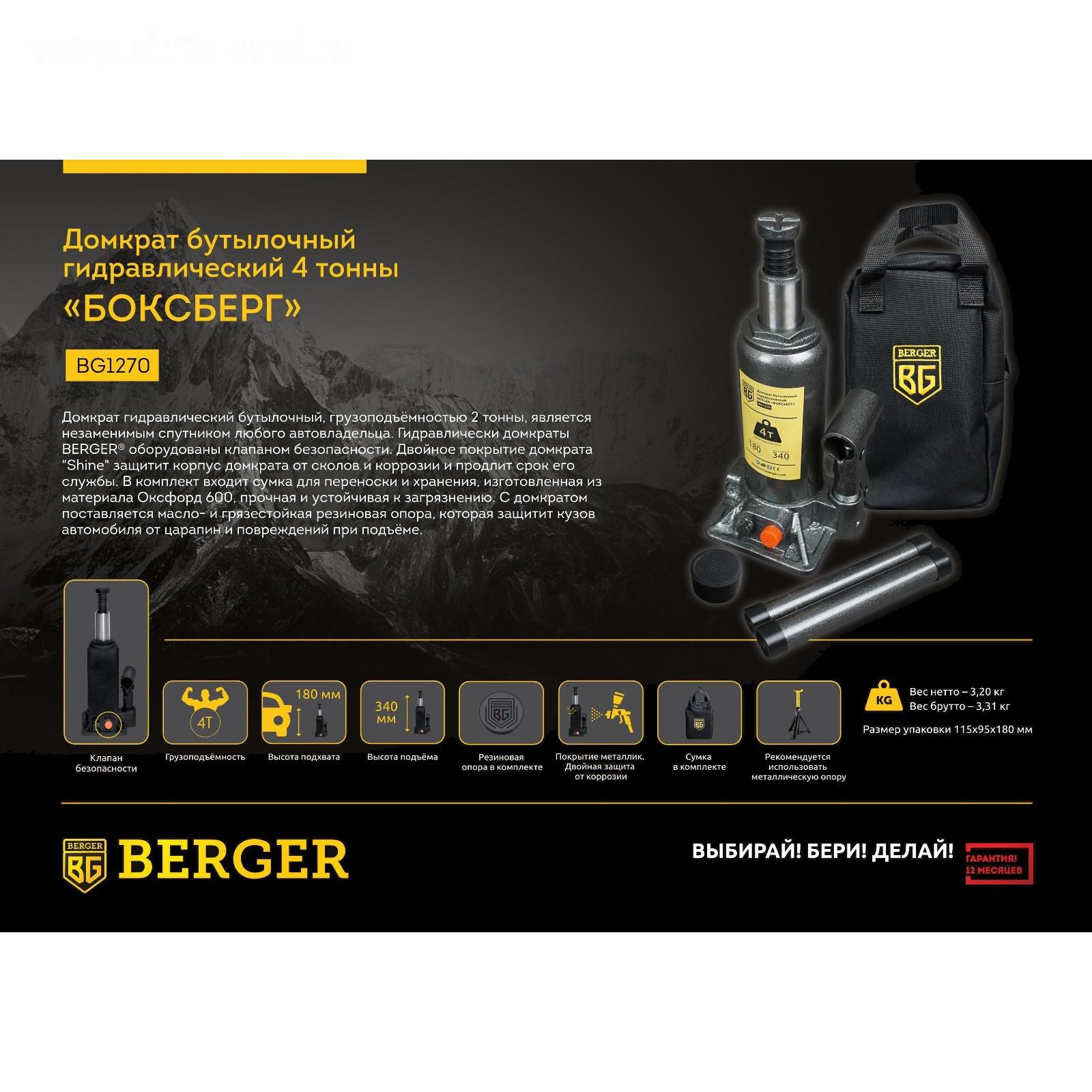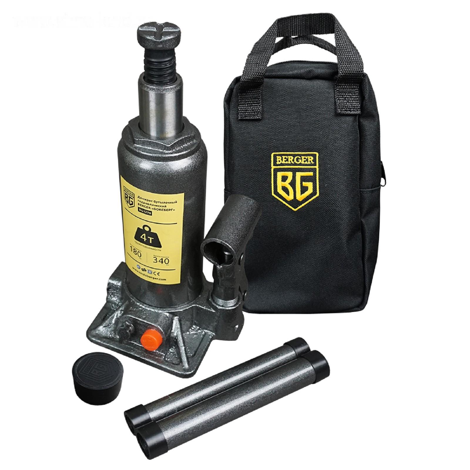 Домкрат гидравлический BERGER BG1270, бутылочный, 4 т, подхват 180 мм, подъем 340 мм