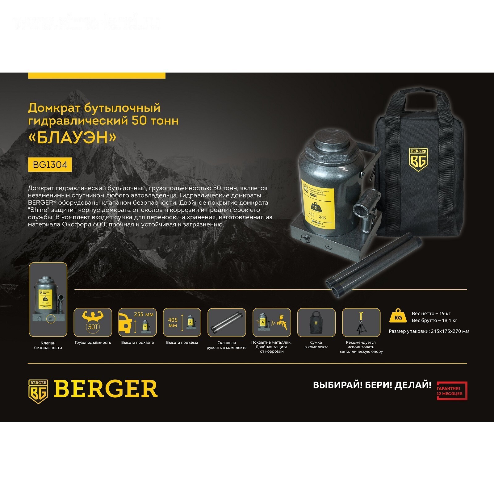 Домкрат BERGER "Блауэн" BG1304, гидравлический, бутылочный, 50 т