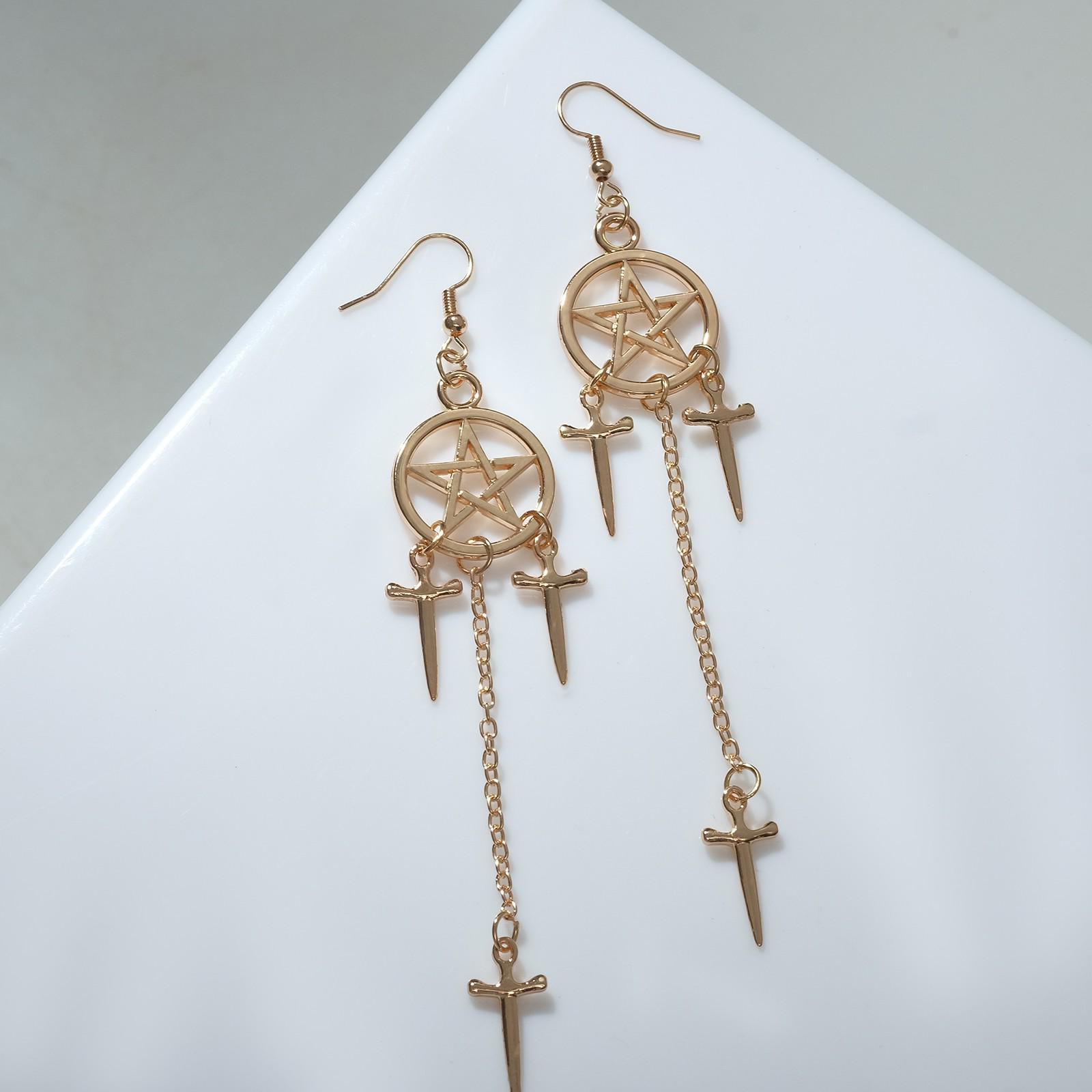 Серьги висячие "Пентаграмма" с кинжалами, цвет золото