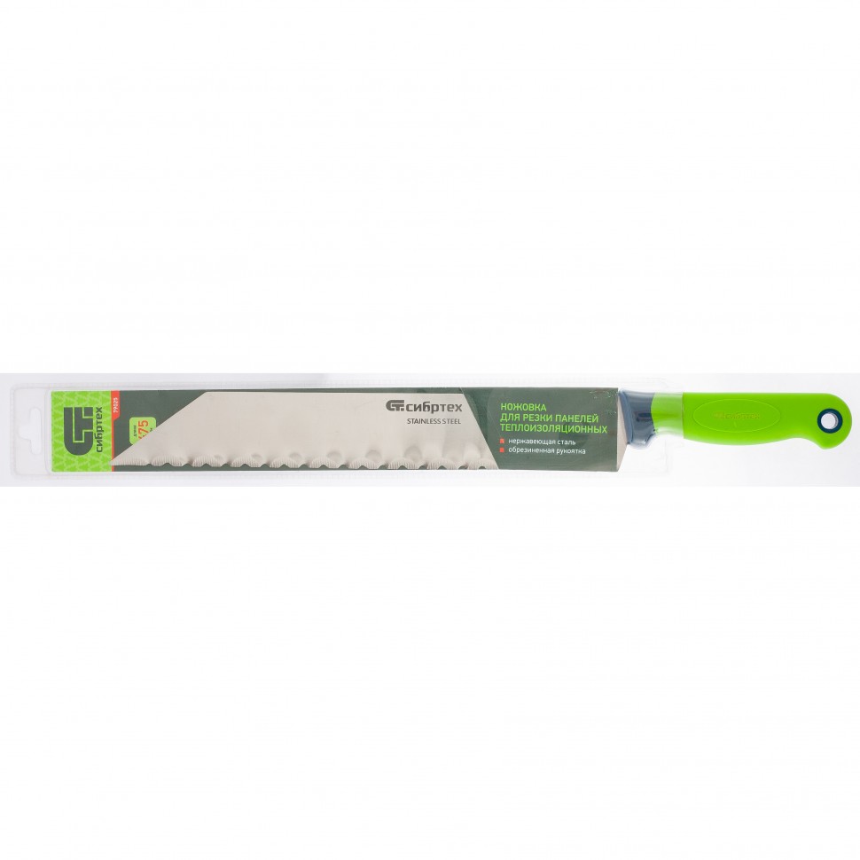 Нож Сибртех 79025 общей длиной 475 мм и длиной лезвия 340 мм, с обрезиненной рукояткой, предназначен для резки теплоизоляционных панелей. Он пригодится в ходе проведения строительных работ при укладке утеплителя. Лезвие длиной 340 мм легко справляется с резкой длинных и толстых пластов.ПреимуществаЗа счет острозаточенного лезвия из нержавеющей стали нож можно использовать в условиях повышенной влажности и на открытом воздухе.Обрезиненная рукоятка предотвращает проскальзывание ножа в руке, что значительно повышает удобство работы.Нож упакован в прочный блистер, его можно безопасно транспортировать и хранить в подвешенном виде.