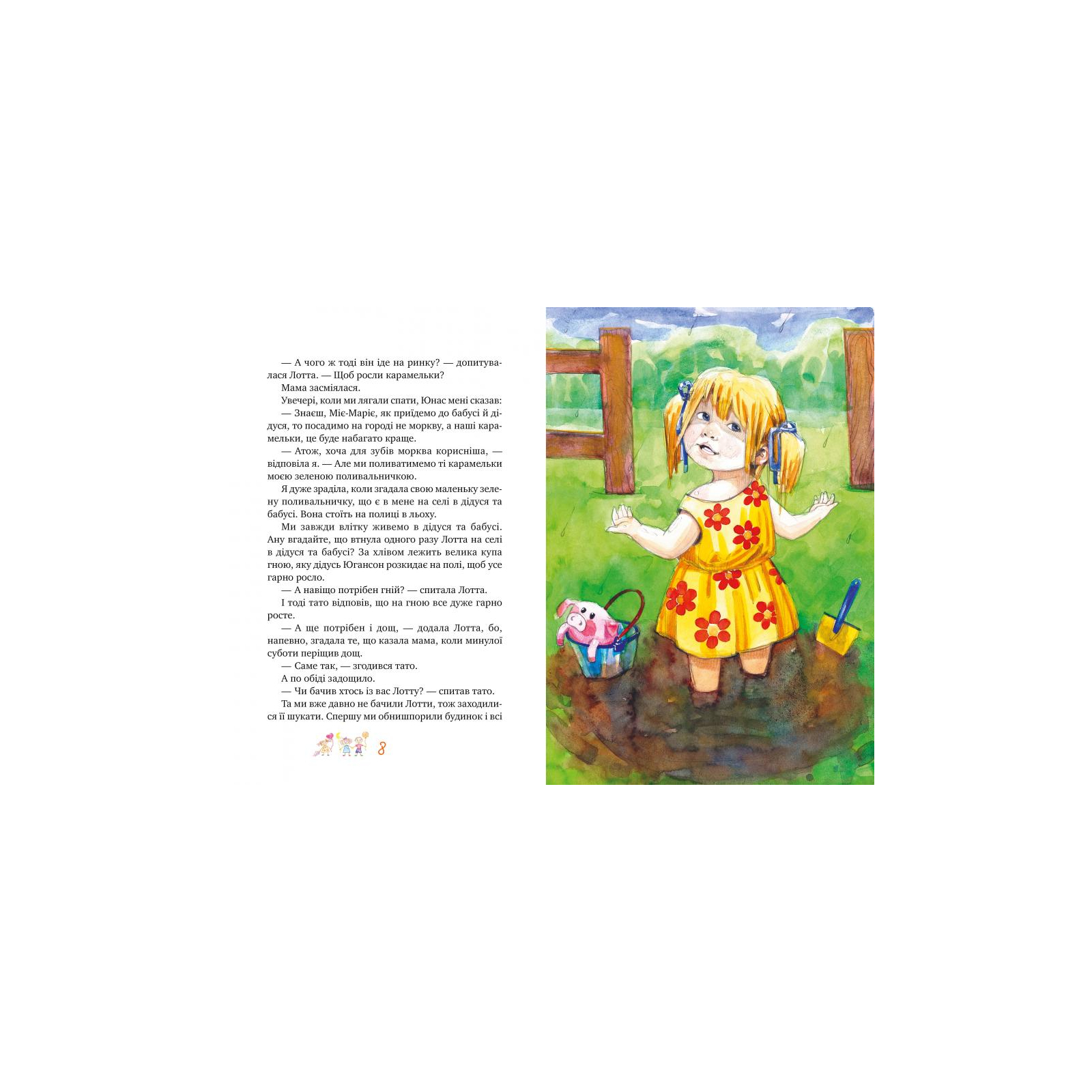 Лотта — найменша донечка в родині Німанів. Вона ще не ходить до школи, тож може втнути таке, чого старші діти вже не роблять. Скажімо, може вибігти на дощ, щоб краще рости, може розпустити тітоньці Берґ недоплетеного светра, може перетворити рожеву ганчір’яну свинку на ведмедика Бурмила, може безстрашно податися з дому (щоправда, зовсім недалечко)… Але найбільше Лотта не любить самоти, тому з нею весело й цікаво. Книжка Астрід Ліндґрен про Лотту та дітей з Бешкетної вулиці давно стала однією з найулюбленіших для юних читачів у всьому світі.