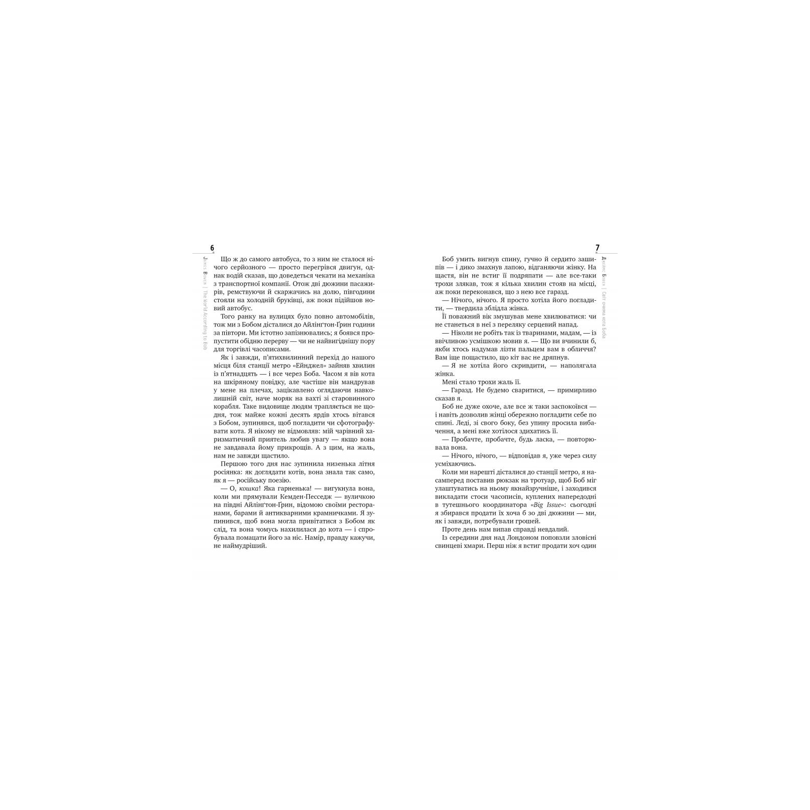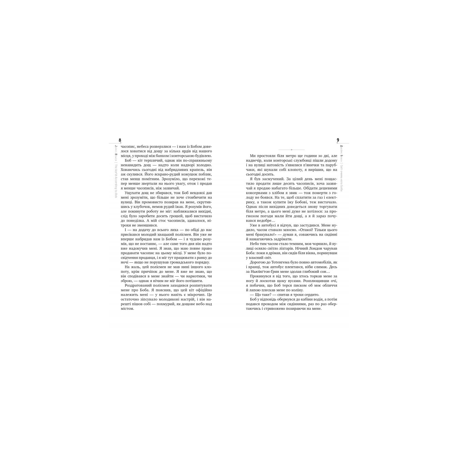 Може здатися, що нова повість Джеймса Бовена «Світ очима кота Боба» — тривіальна історія про рудого вуличного кота й колишнього наркомана. Проте в усіх кумедних і сумних епізодах читач бачить людину, яка, навіть попри трагічний збіг обставин, прагне стати ліпшою. Автор розповідає про те, як був склад ним підлітком, як «підсів» на зілля, як десять років поневірявся в Лондоні та як рудий вуличний кіт допоміг йому здолати згубну звичку і віднайти віру в себе та людей.