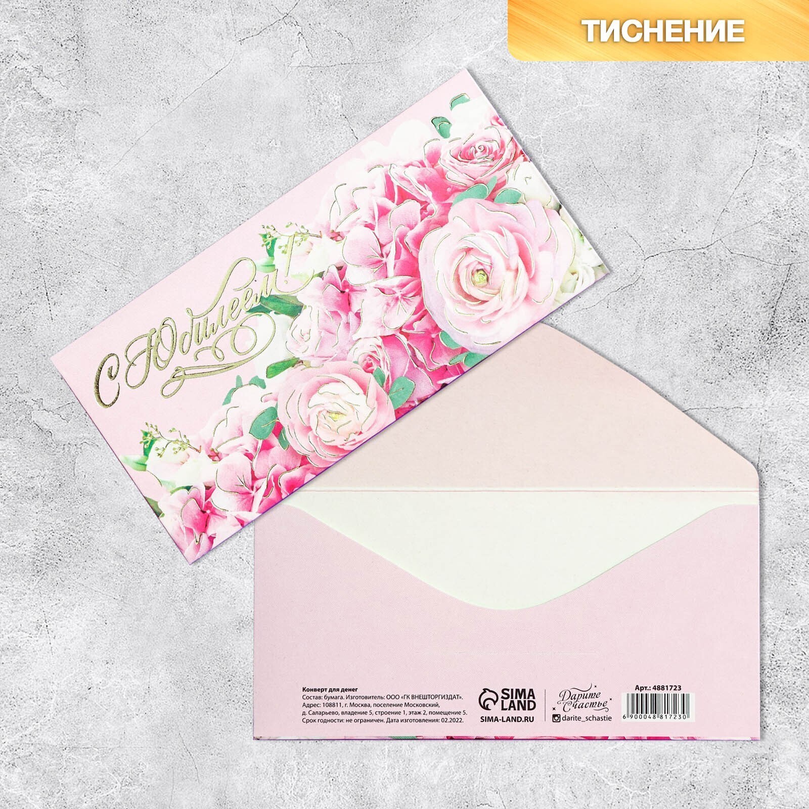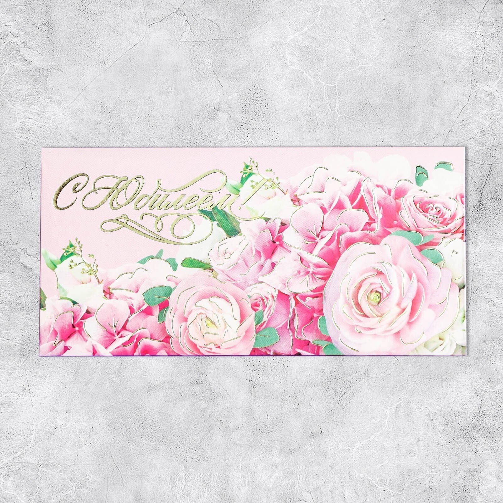 Конверт для денег "С Юбилеем!" тиснение, цветочный букет