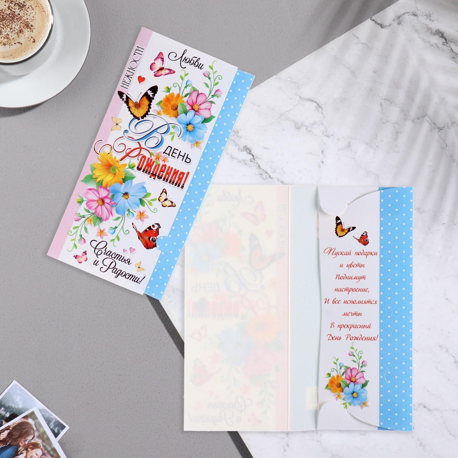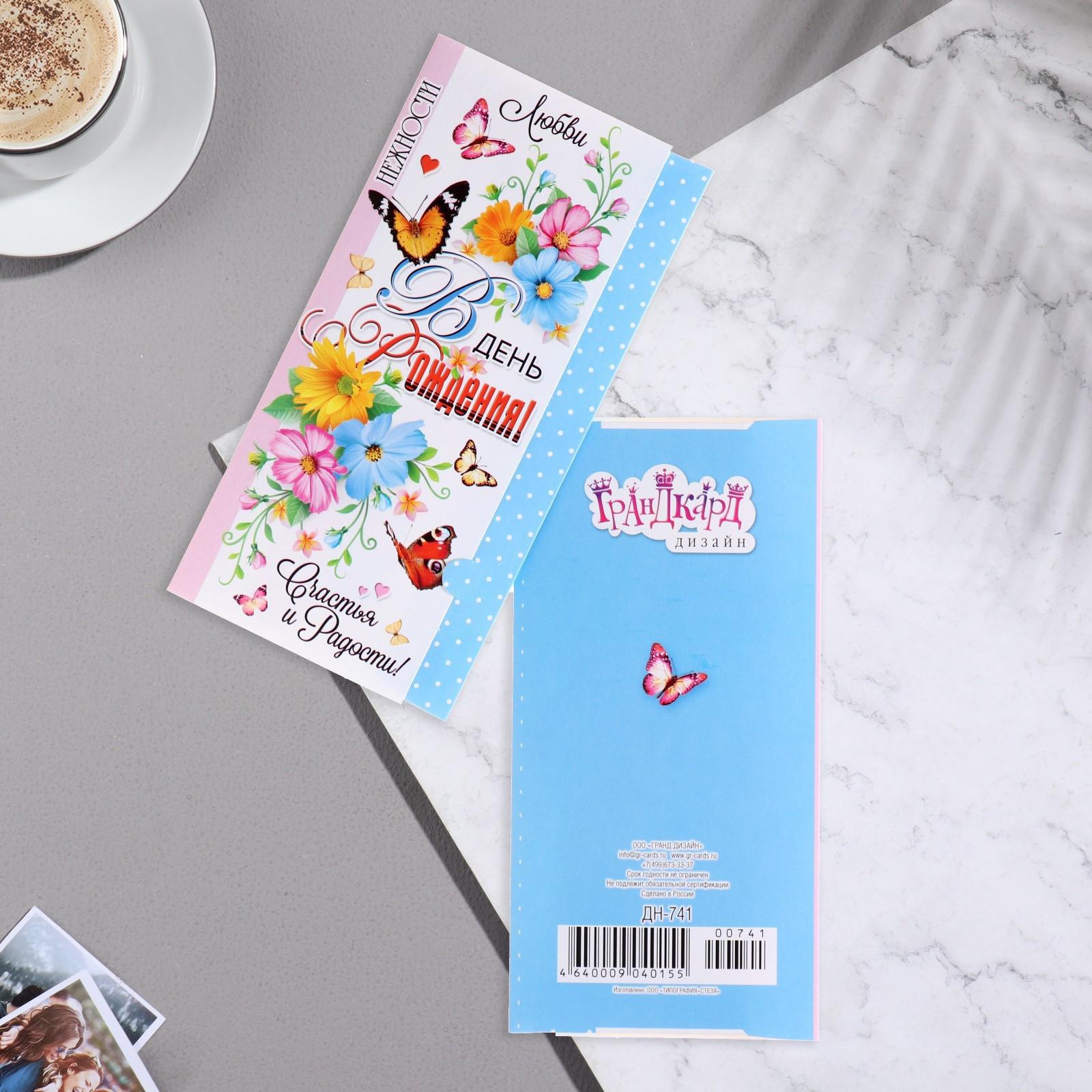 Конверт для денег "В День Рождения!" белый фон, бабочки, цветы, 16х8 см