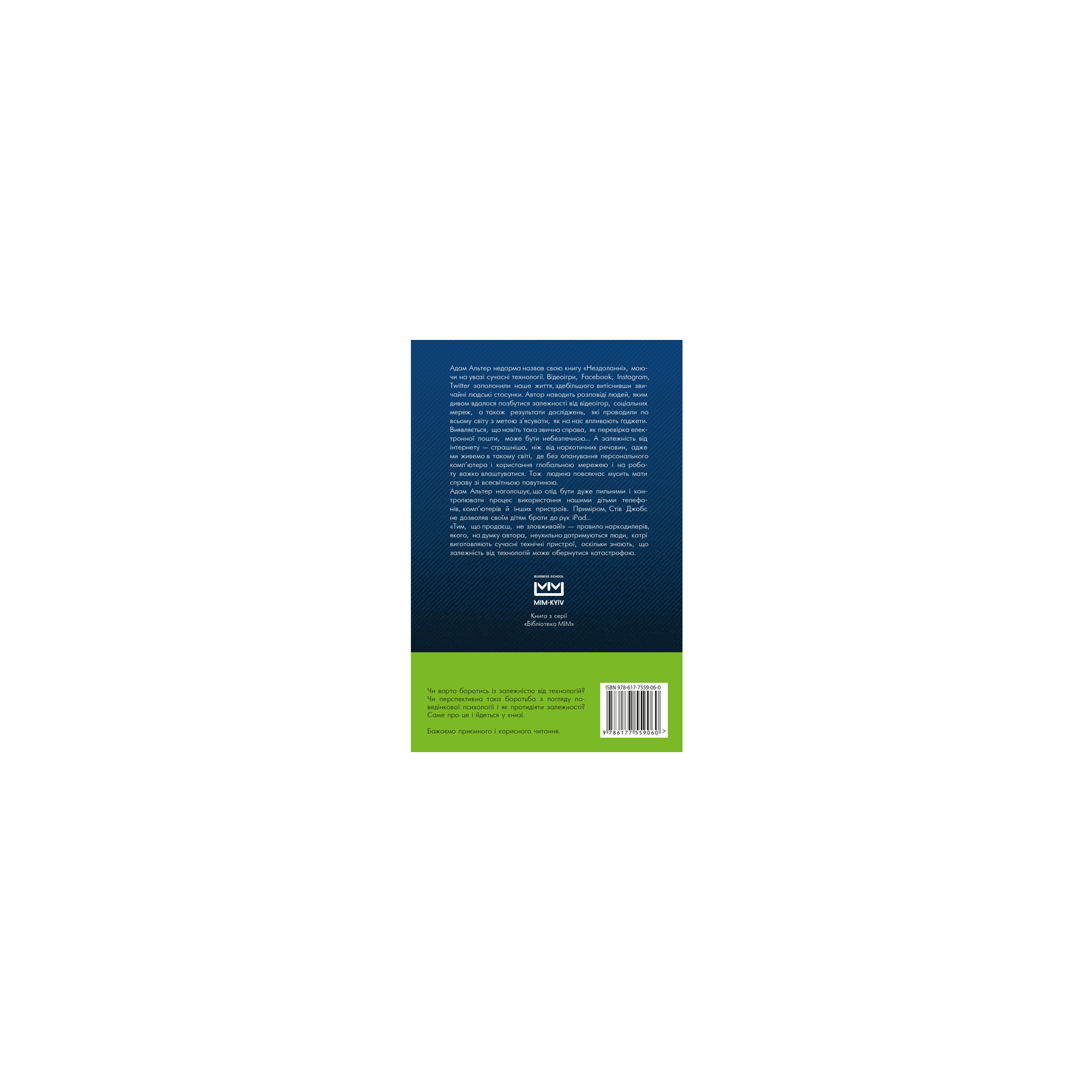 Сучасні технології – нездоланні. Вони створені допомагати. Але в наш бурхливий час можуть стати і проблемою. Залежність від ґаджетів та соцмереж відбирає наш час, не дає можливості сконцентруватися на важливих віхах свого життя. Вкрадені залежністю можливості гальмують подальший розвиток як окремої людини, так і суспільства в цілому. Детальний опис механізмів маніпуляцій свідомістю та протистояння їм стало основою книги «Нездоланні» Адама Альтера. Приведені дані досліджень нейробіологів та психофізіологів, психологічні тести, велика кількість посилань, прикладів та реальних історій дозволяють віднайти здоровий баланс співіснування Людини і Технологій.