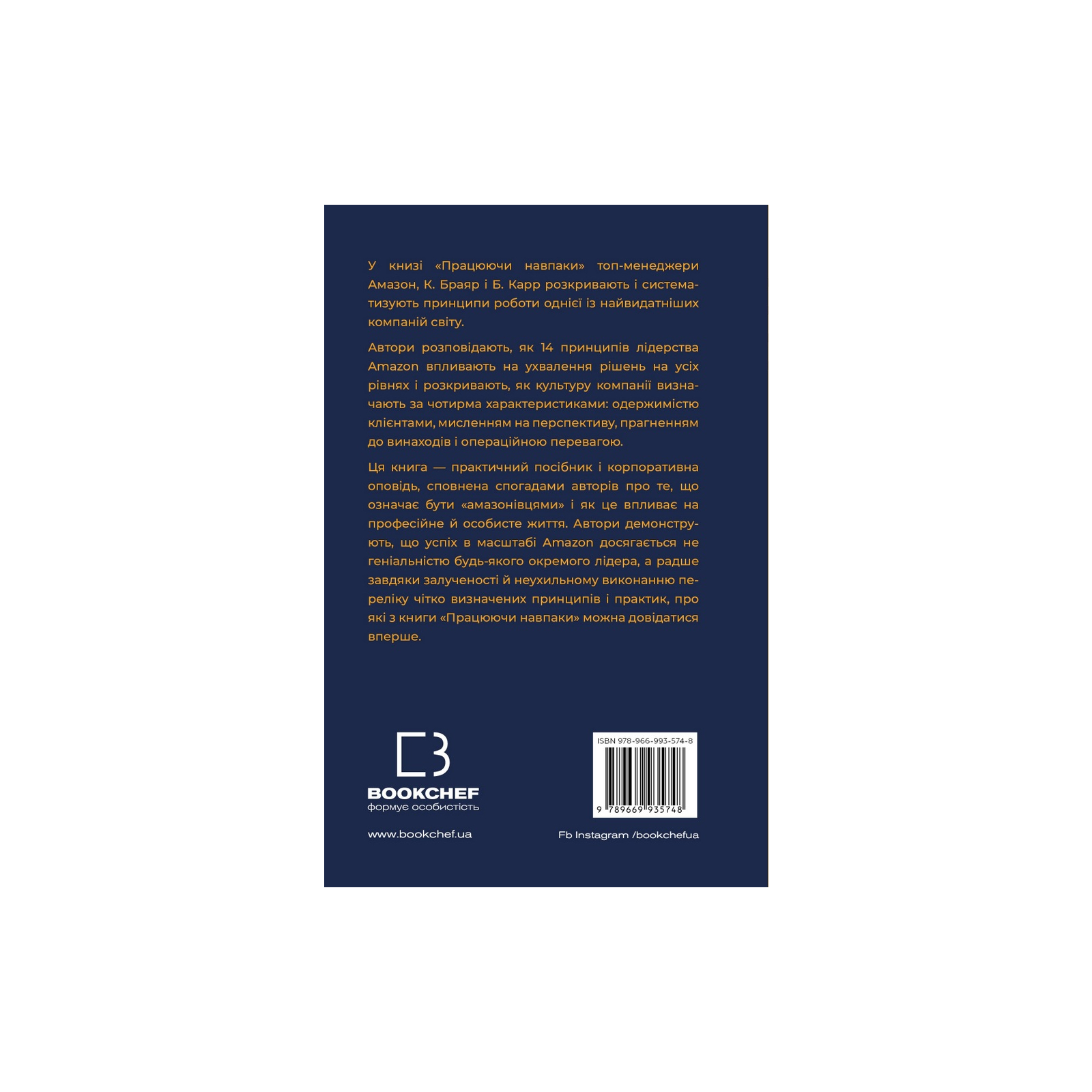 Ця книга — практичний посібник і корпоративна оповідь, сповнена спогадами авторів про те, що означає бути амазонцями і як це впливає на професійне й особисте життя. Автори демонструють, що успіх в масштабі Amazon досягається не геніальністю будь-якого окремого лідера, а радше завдяки залученості й неухильному виконанню переліку чітко визначених принципів і практик, про які з книги «Працюючи навпаки» можна довідатися вперше.