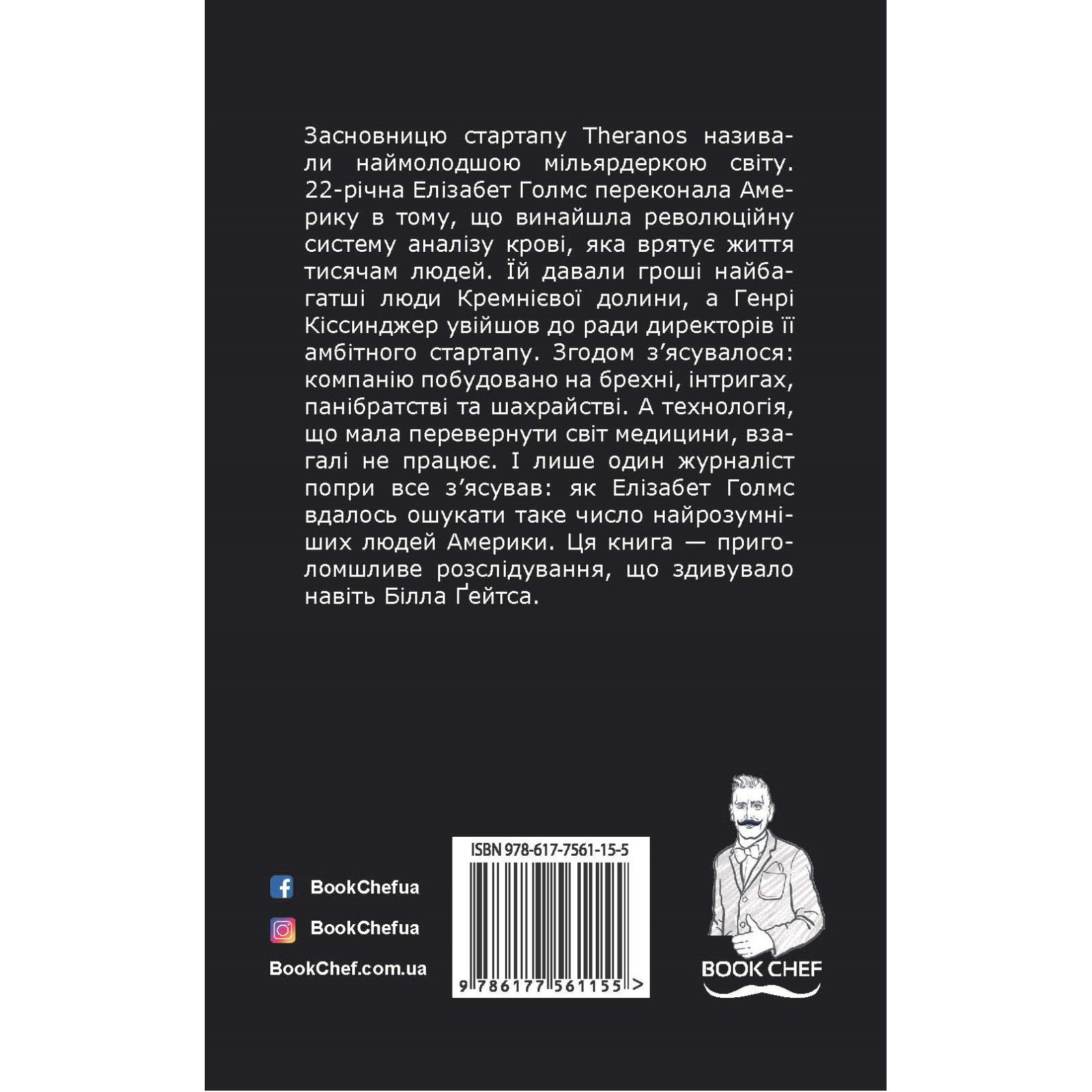 Засновницю стартапу Theranos називали наймолодшою мільярдеркою світу. 22-річна Елізабет Голмс переконала Америку в тому, що винайшла революційну систему аналізу крові, яка врятує життя тисячам людей. Їй давали гроші найбагатші люди Кремнієвої долини, а Генрі Кіссинджер увійшов до ради директорів її амбітного стартапу. Згодом з’ясувалося: компанію побудовано на брехні, інтригах, панібратстві та шахрайстві. А технологія, що мала перевернути світ медицини, взагалі не працює. І лише один журналіст попри все з’ясував: як Елізабет Голмс вдалось ошукати таке число найрозумніших людей Америки. Ця книга — приголомшливе розслідування, що здивувало навіть Білла Ґейтса.