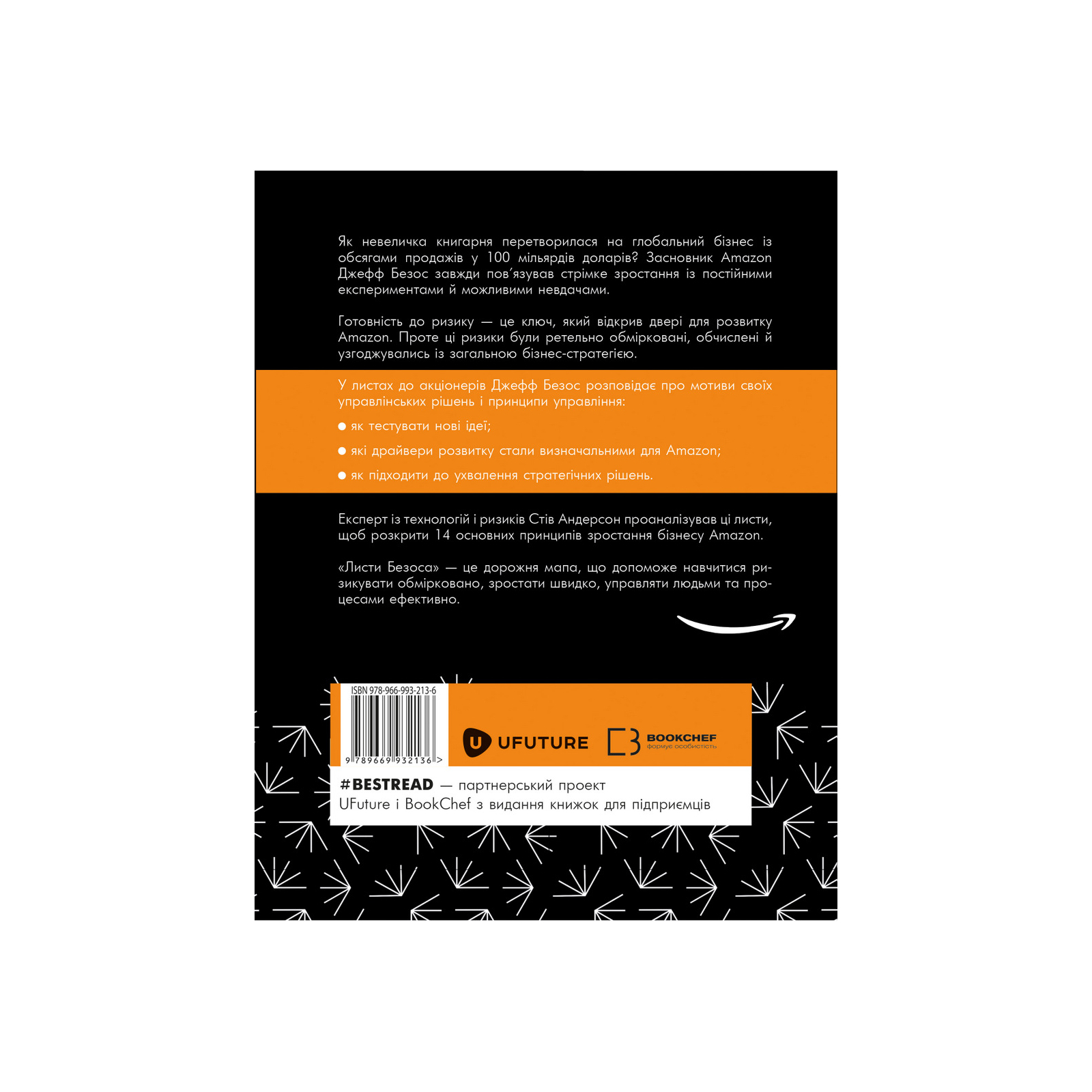 Експерт із технологій і ризиків Стів Андерсон проаналізував ці листи, щоб розкрити 14 основних принципів зростання бізнесу Amazon. ""Листи Безоса"" — це дорожня мапа, що допоможе навчитися ризикувати обмірковано, зростати швидко, управляти людьми та процесами ефективно.