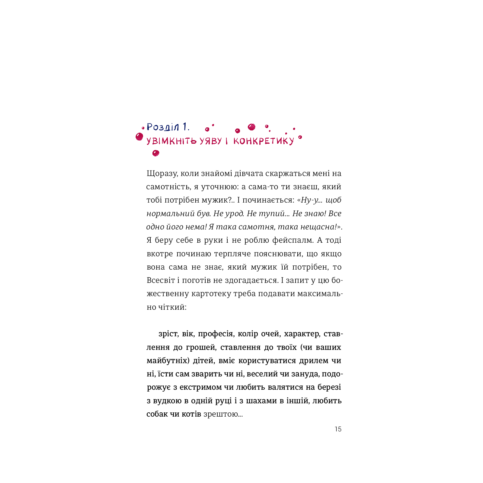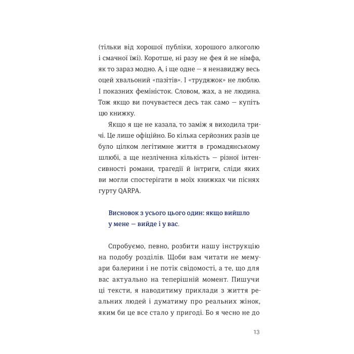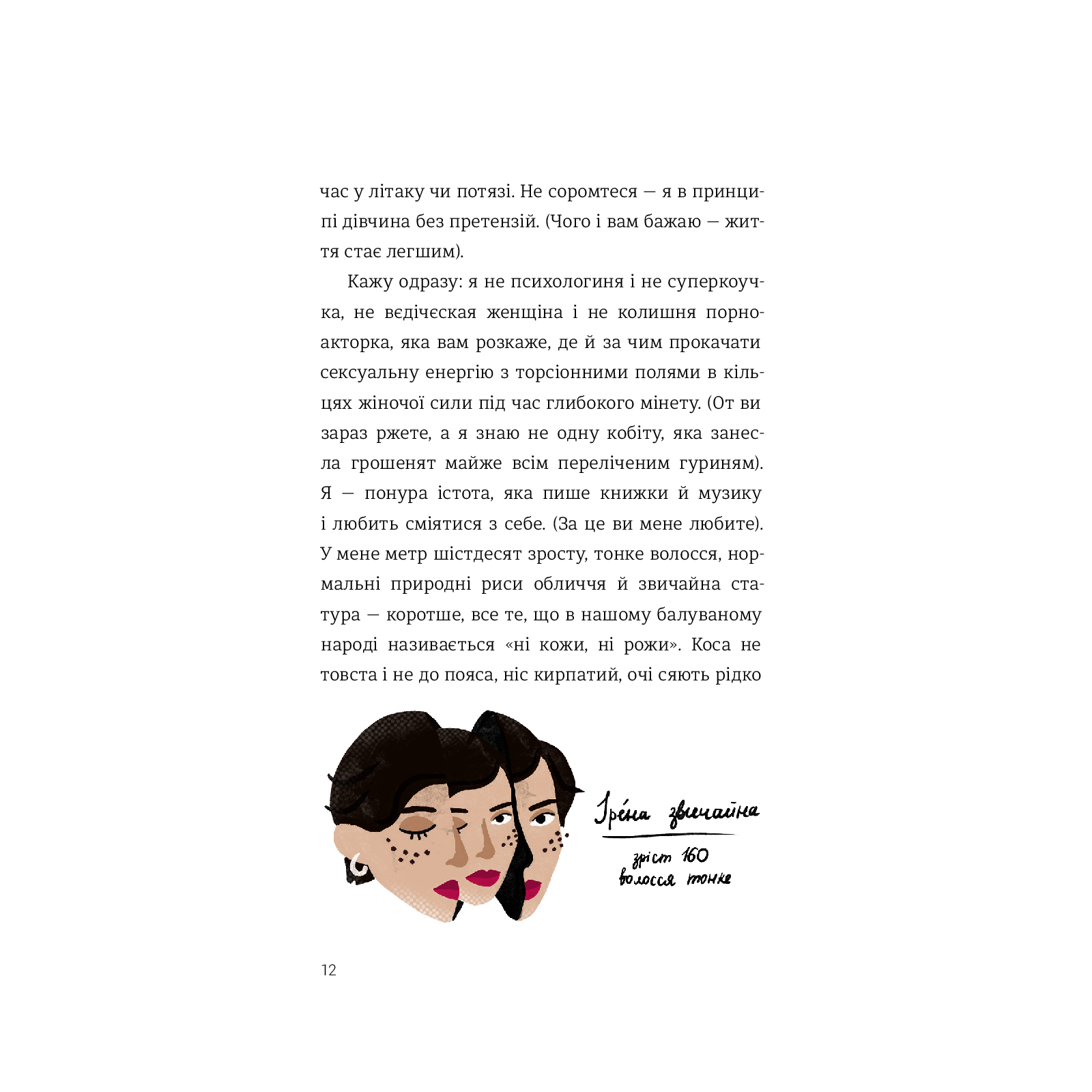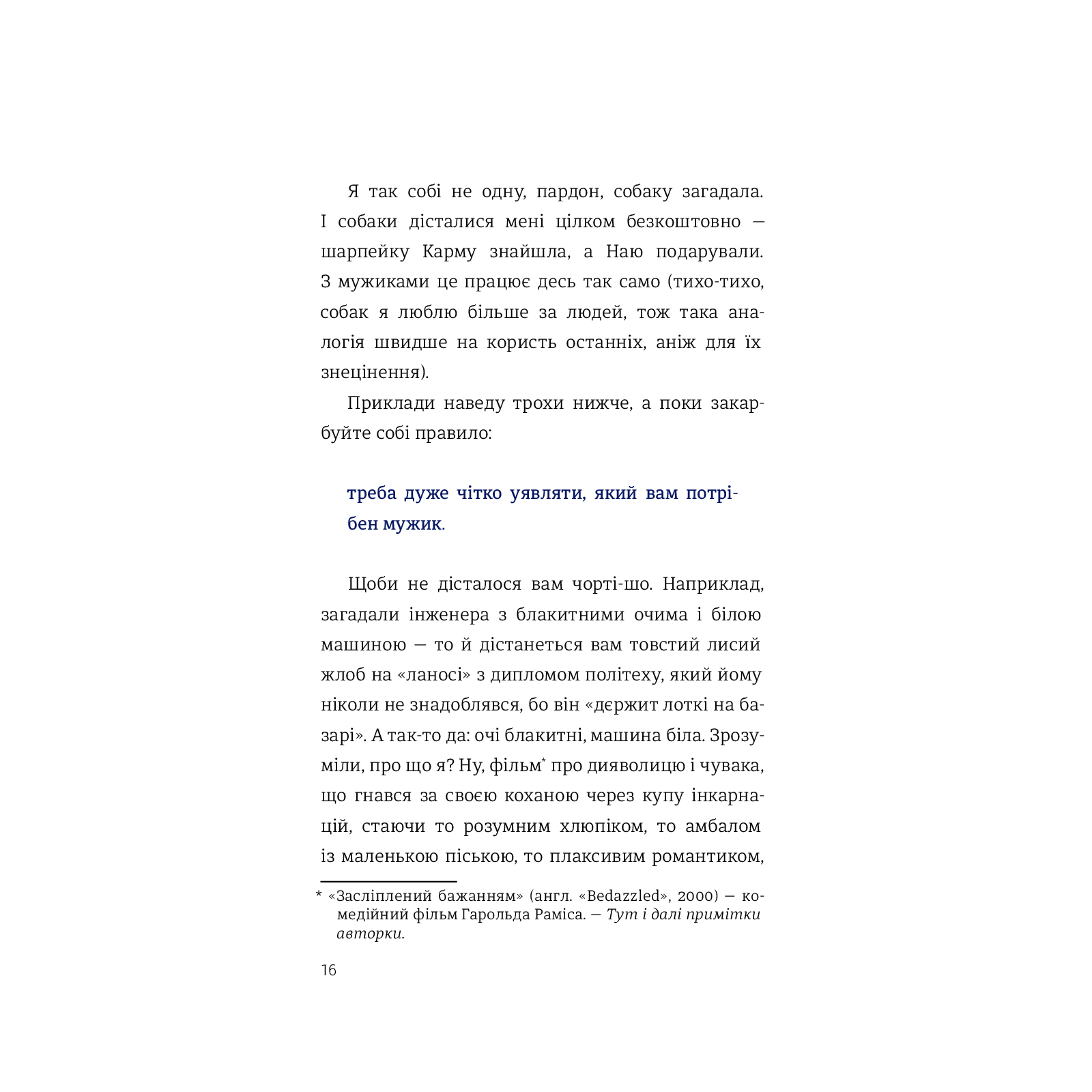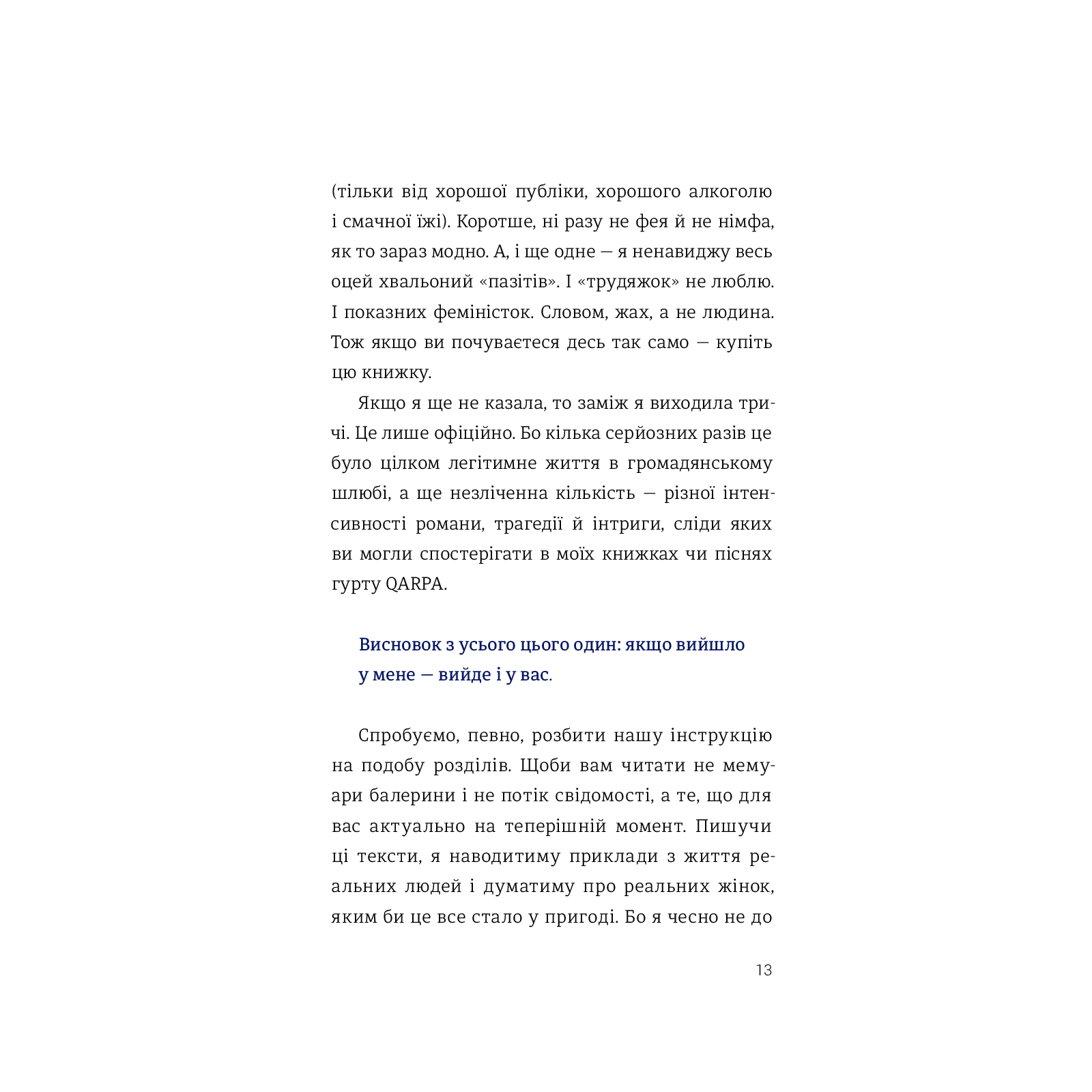 Крім того, письменниця наголошує, що не прагне займатися менторством і вдавати з себе гуриню й психологиню, її книжка — це всуціль життєвий досвід і висновки з її досвіду стосунків із чоловіками.