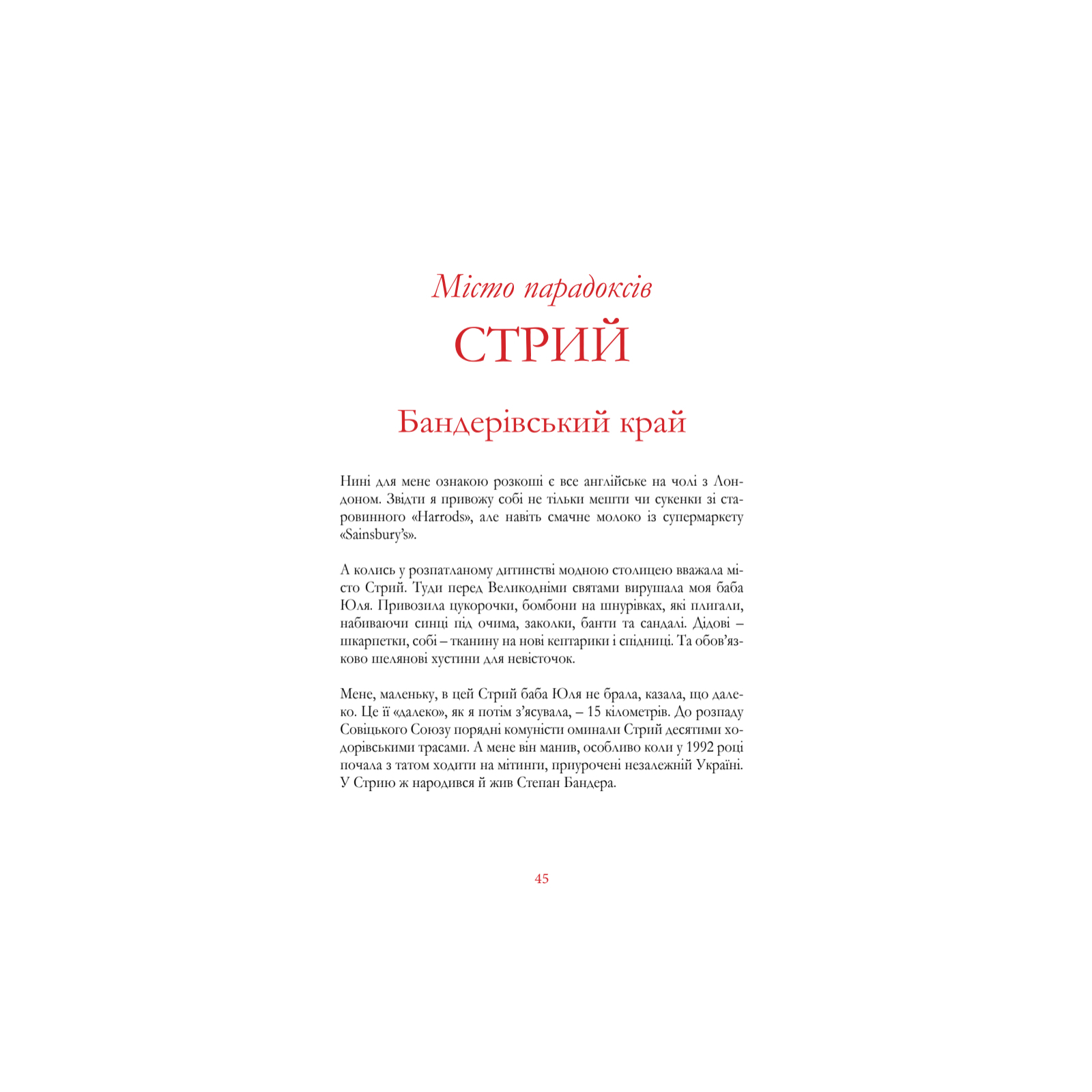 За задумом авторки, ця книжка — більш ніж путівник або щоденник нотаток, які О. Фреймут зробила під час подорожі Західною Україною. До вашої уваги — неcподівані візії міської культури, готелів, ресторанів, кав’ярень і майже візіонерські розповіді про зачаєних духів міста… У своїх історіях, поміж емоцій і спостережень, головна героїня ламає стереотипи й життєві сценарії, щоб вивільнити найсокровенніше, що ховається за видимими декораціями. Не без іронії, через алогізми й неологізми, навіть фреймутизми, щоб як найповніше передати ментальний колорит мешканців і міст, і сіл, життя яких нагадує обряд прогулянки Алеєю Випендрювання, а готування їжі перетворюється на містичний акт.