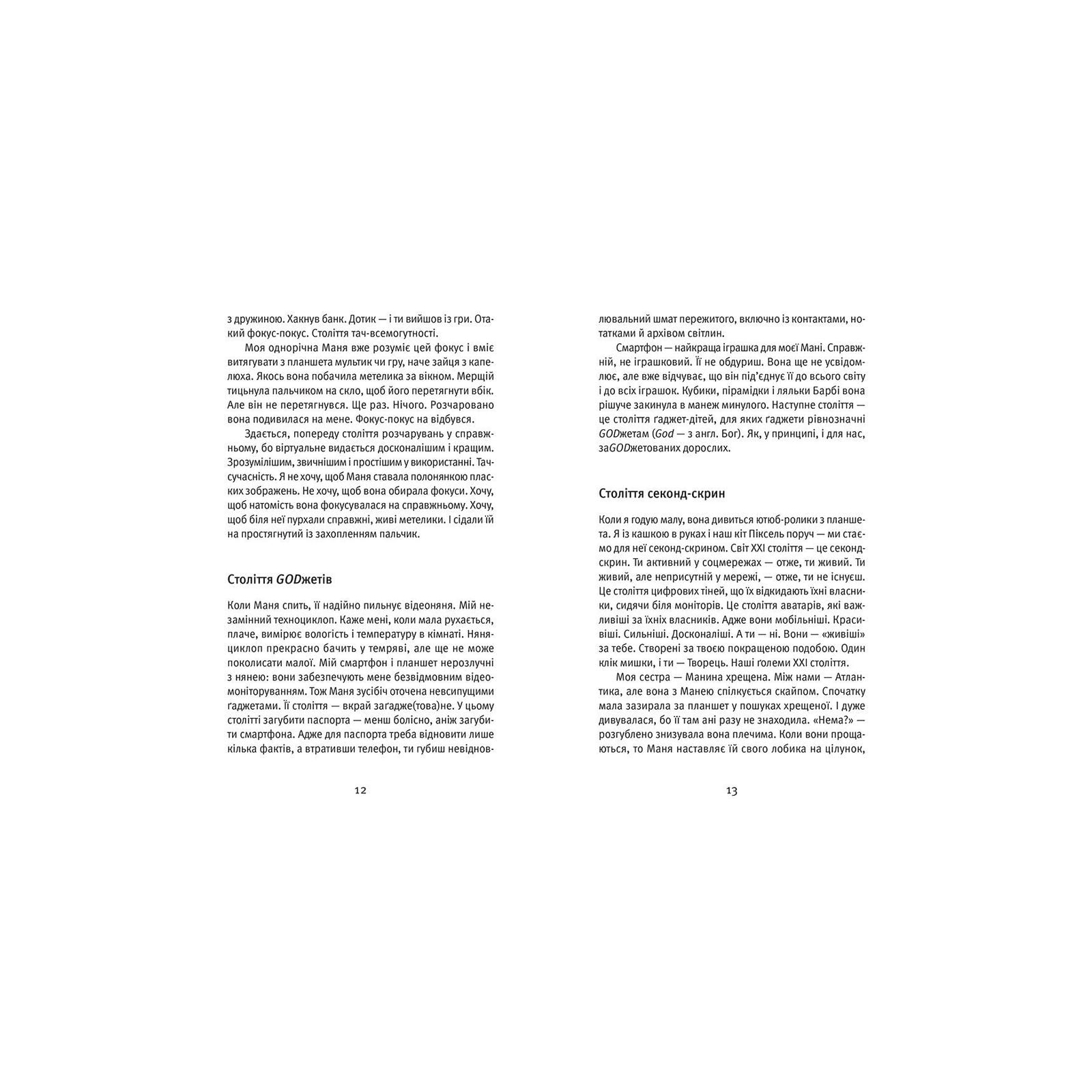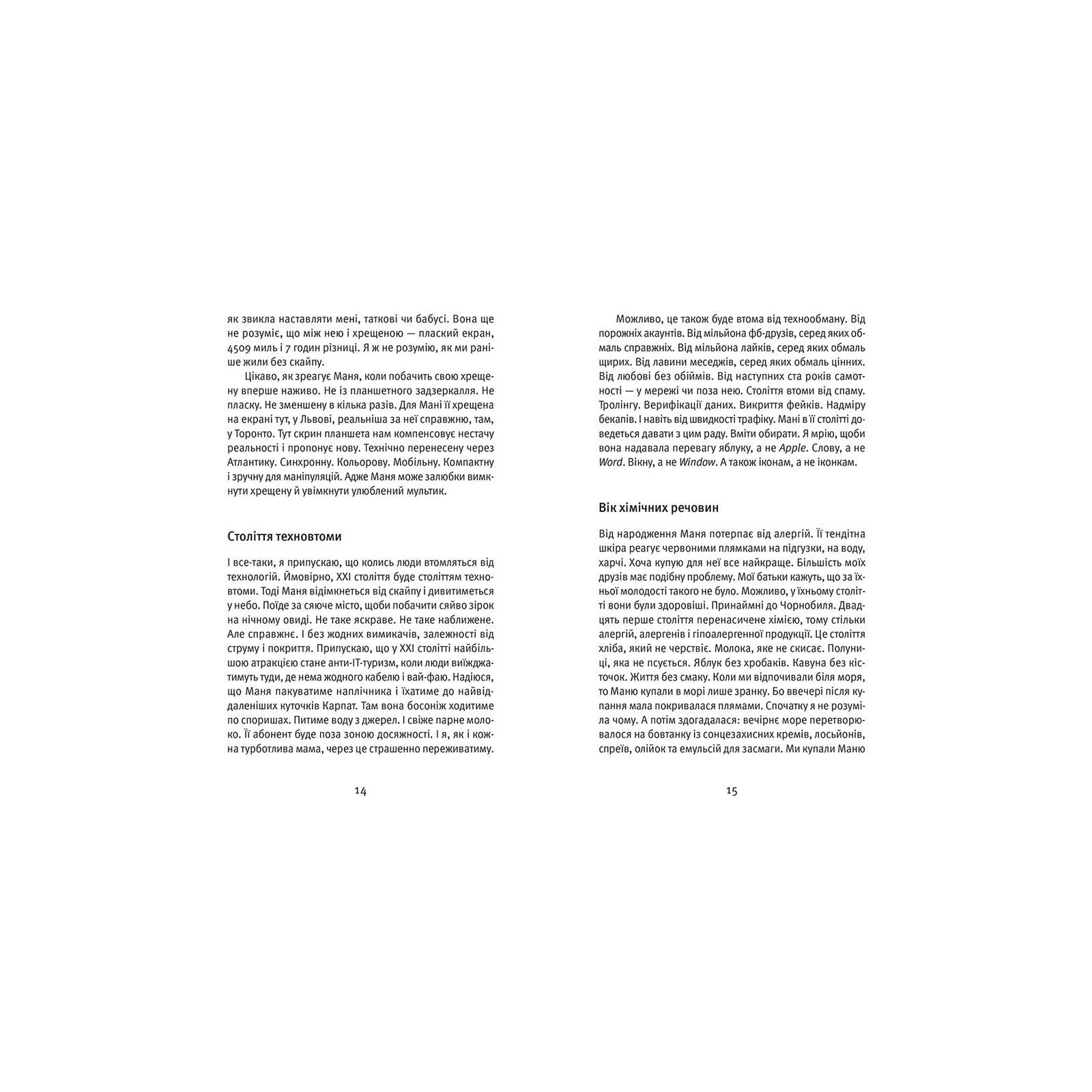 Ця книжка — про комунікацію, але цілком із незвичного ракурсу. Порівнюючи спілкування дорослих і дітей (на прикладі своєї доні), авторка робить несподівані відкриття. Зокрема про те, що ми, дорослі, втрачаємо наше дитяче вміння комунікувати по-справжньому: на рівні слів, мовчання, співопису, обіймів, цілунків, запахів тощо. А ще втрачаємо свіжий погляд на себе, на світ і на речі у ньому.