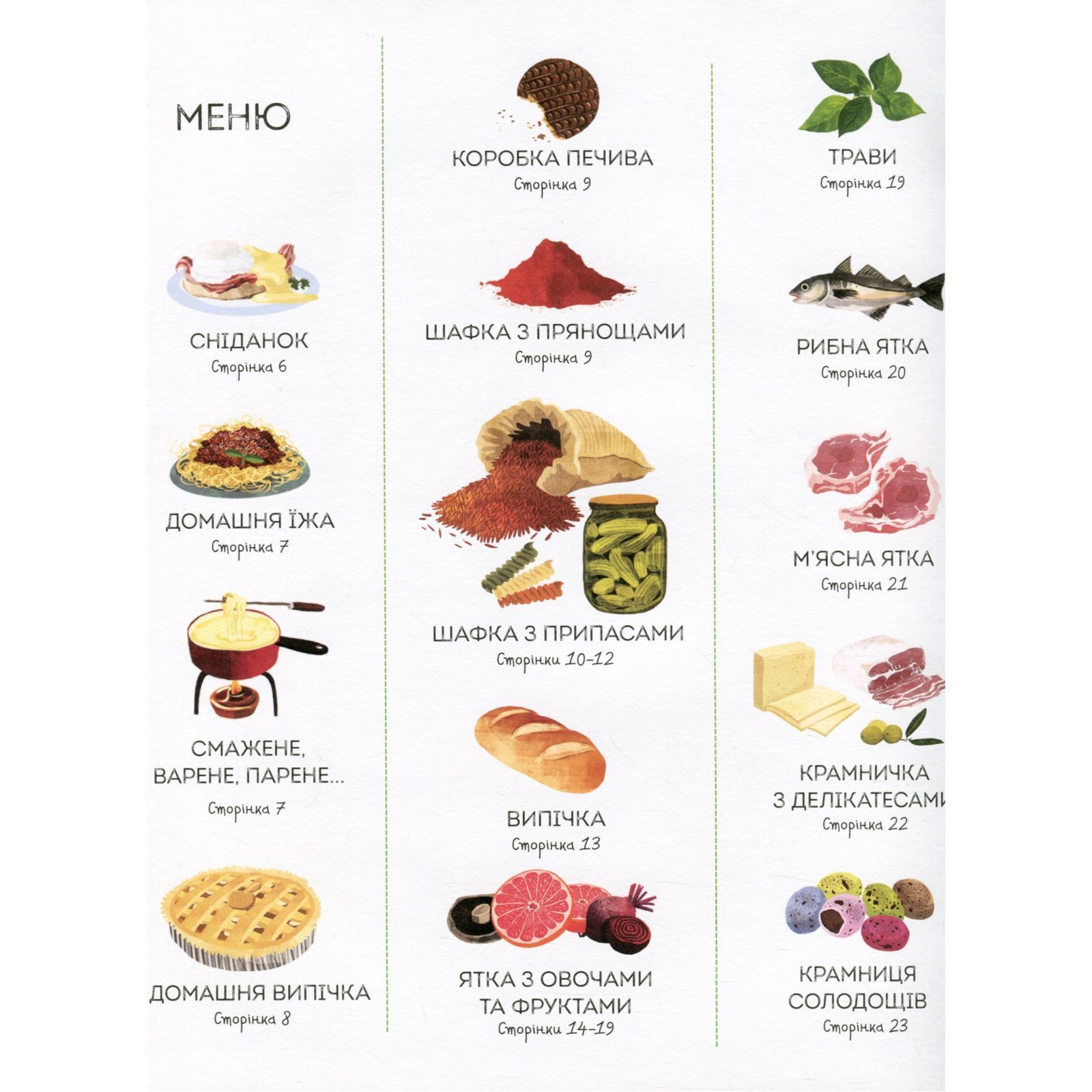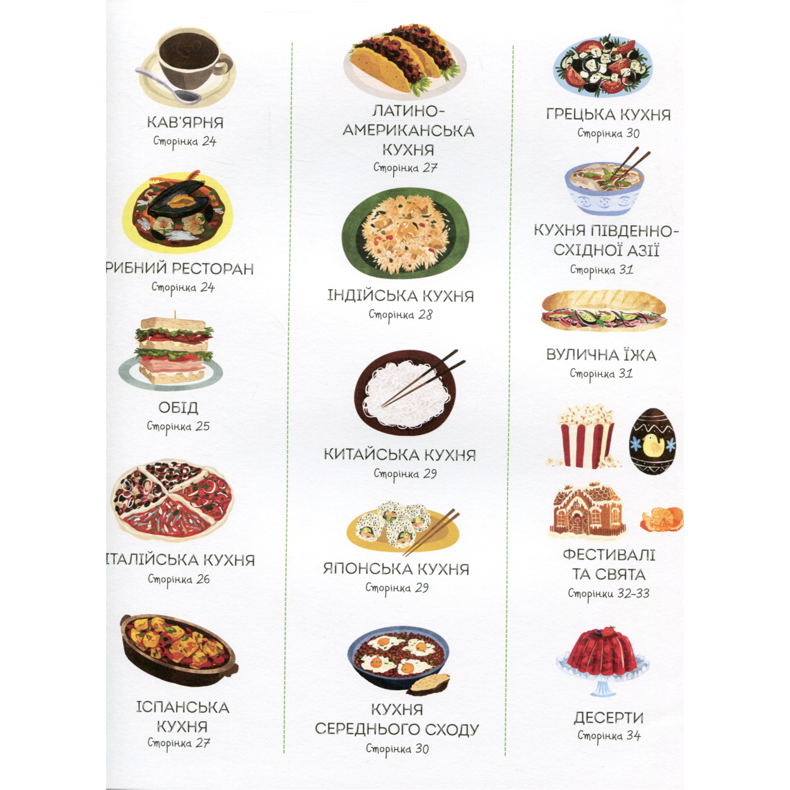 Ця велика ілюстрована книга познайомить вас із яскравим розмаїттям страв та смаків з усього світу. На її сторінках ви зустрінете безліч смачних назв — як знайомих усім, так і екзотичних. У цій книзі наведено аж 1000 різноманітних страв.